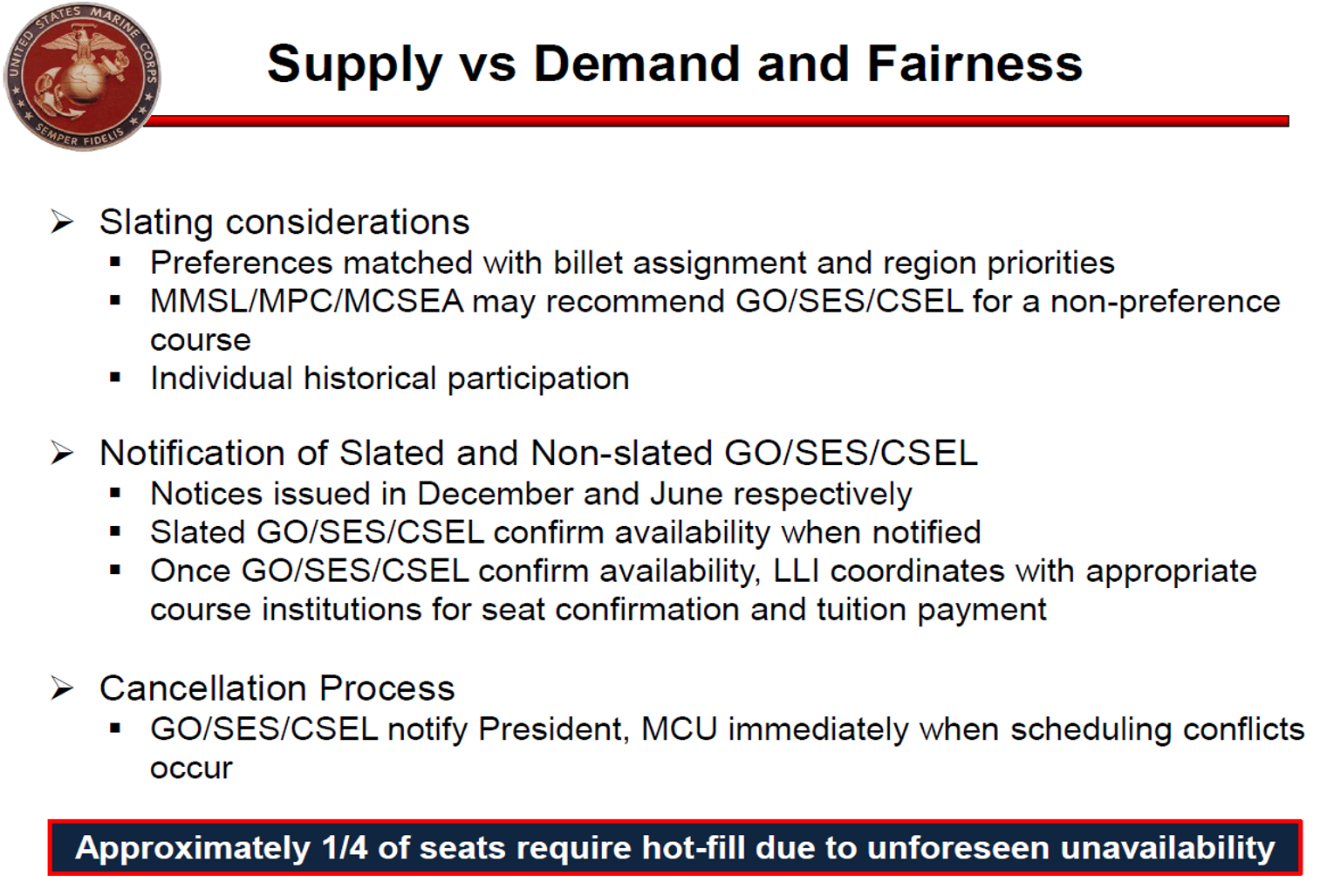 The Commandant of the Marine Corps established the Senior Leader Development Program (SLDP) in 2004 in order to provide structure to the professional growth and assignment strategy of General Officersand Senior Executive Service personnel. As a source for managing senior leader educational matters, the SLDP serves as the advocate for GO/SES continuing educational opportunities. On 08 March 2017 the Senior Leader Development Program was re-named the Executive Education Program (EEP) via Green Letter 1-17 and updated 13 May 2020 via Green Letter 1-20. The most recent update on 15 December 2022 by White Letter 1-22 expanded the program to Senior Enlisted serving at the General Officer level.