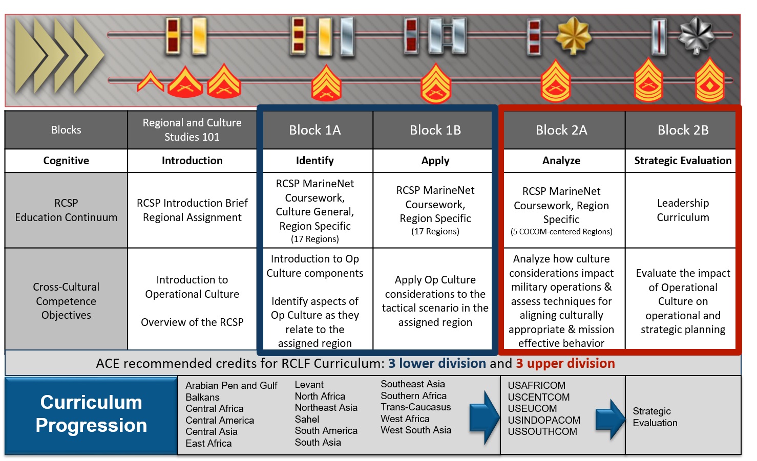 The RCSP is founded on culture general concepts and skills. Through this program, the Marine Corps instills in Marines transferable cultural concepts and skills that can be used in any operating environment and intercultural exchange. Marines gain insights into human behavior, alternative ways to problem solve, application of lessons learned from other areas of the world, and the ability to access and critically consume information. Marines are then provided regional and cultural content that displays these concepts and skills so that Marines can apply and reflect on them in specific context. The rationale for Marines’ being assigned a region is that it elevates the Marine Corps’ understanding of all parts of the world, not just those the Corps routinely engages, so as to heighten preparedness for the unexpected.