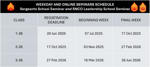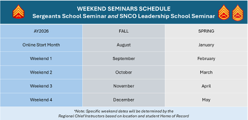 Important Note for Reserve Marines: Weekend seminars are fully funded by Marine Forces Reserve, meaning travel and lodging are covered. Weekday and Online seminars are not funded for Reserve Marines.