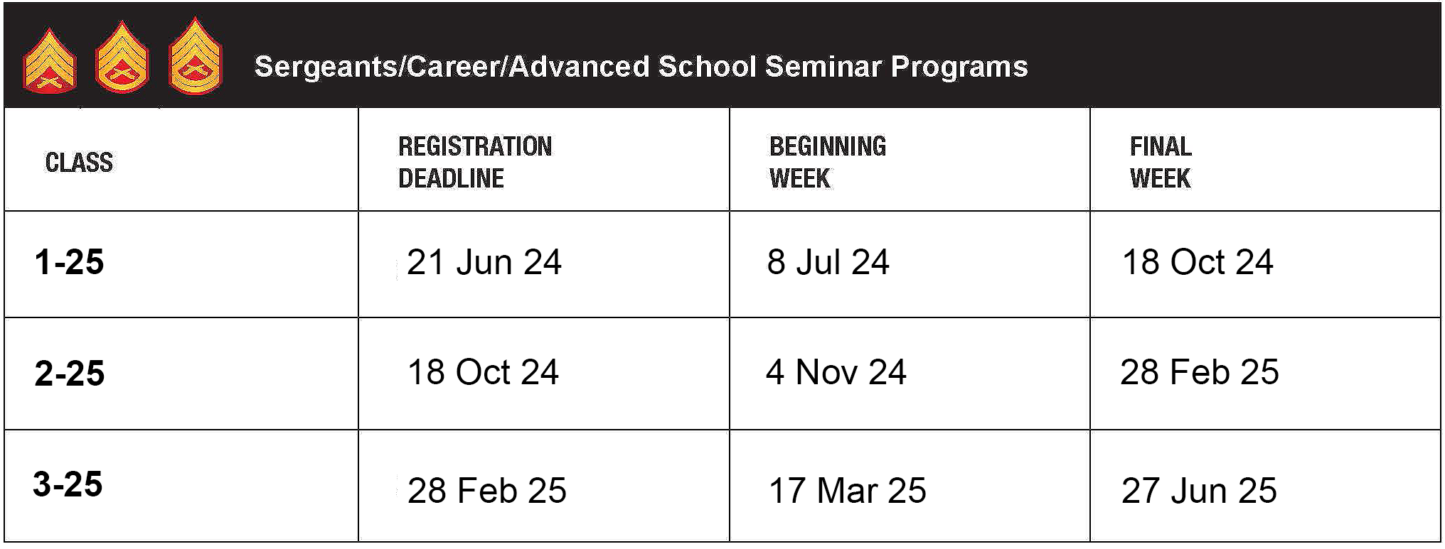 Marines who have already completed the legacy Career or Advanced Schools are considered complete with this requirement and will not be required to complete the SNCO Leadership School, per MARADMIN 627/24. This applies to Total Force.