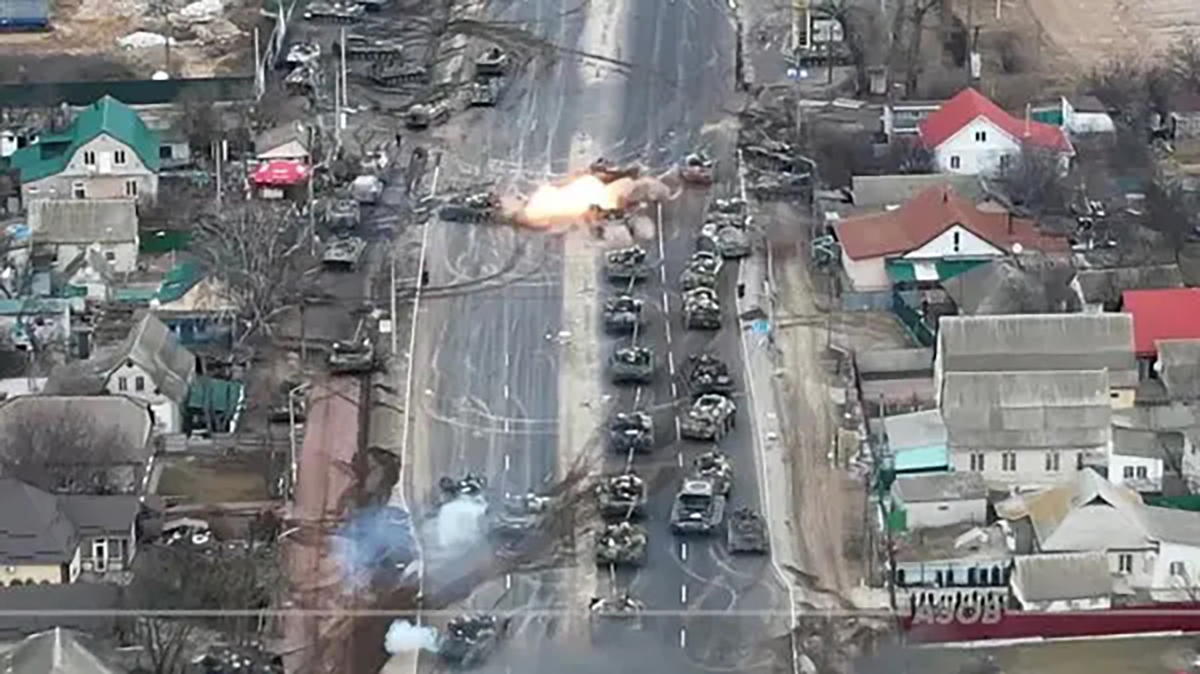 Figure 1. Russian tank column being ambushed in Brovary, on the outskirts of Kyiv, by Ukrainian forces