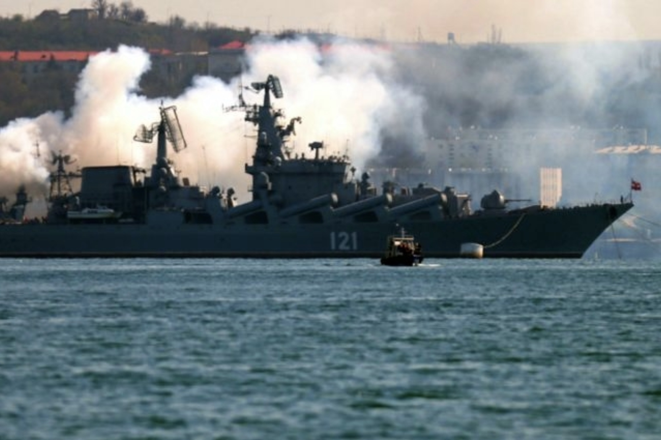Figure 2. Russian cruiser Moskva being towed after suffering damage in the Black Sea, 19 April 2022; the warship later foundered and sank