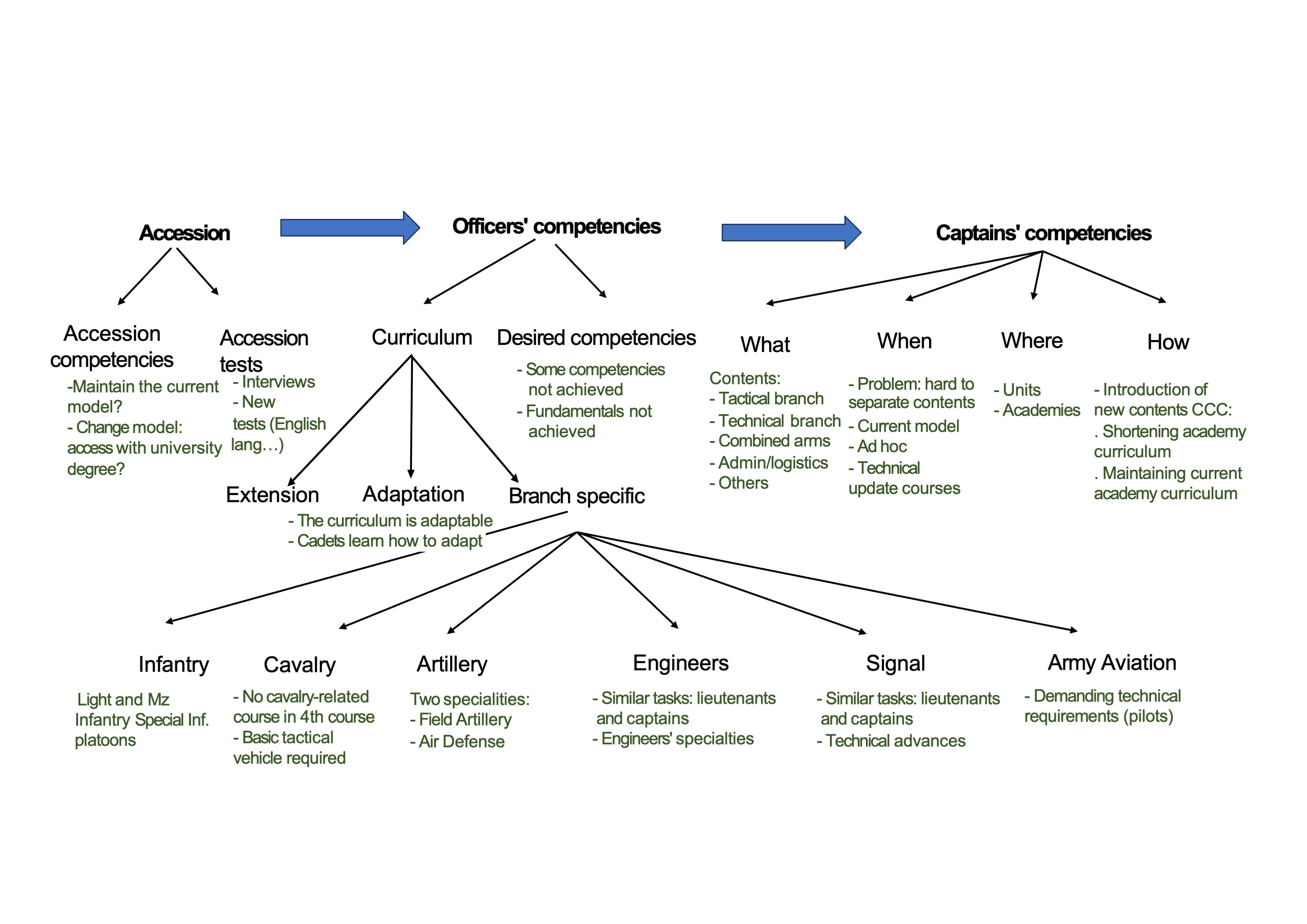 But another important consideration that should be analyzed is the implications of leaving all captain-level specific competencies to be achieved at a later moment in the officer career. Theoretically, by doing so, the number of academic curriculum courses could be reduced. However, it seems that this is not easily accomplished in some of the army branches, mainly in engineers, communications, and artillery.