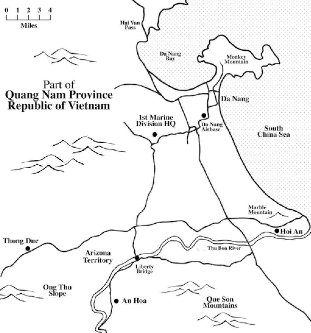 The 5th Marines spent five years in Vietnam between 1966–71, much of that time based in a small, remote village called An Hoa in the province of Quang Nam in central South Vietnam. Serving as one of three infantry regiments of the lst Marine Division (lst MarDiv), along with the 1st and 7th Marines, the 5th Marines at An Hoa were the closest Marine unit to North Vietnamese Army (NVA) units infiltrating Vietnam from Laos, home to the network of roads known as the Ho Chi Minh Trail. The regiment’s mission was to find, fix, and destroy the NVA as it attempted to attack Da Nang, a major city in the province and, more importantly, the Da Nang Air Base, a major NVA target and, at the time, the busiest airfield in the world.