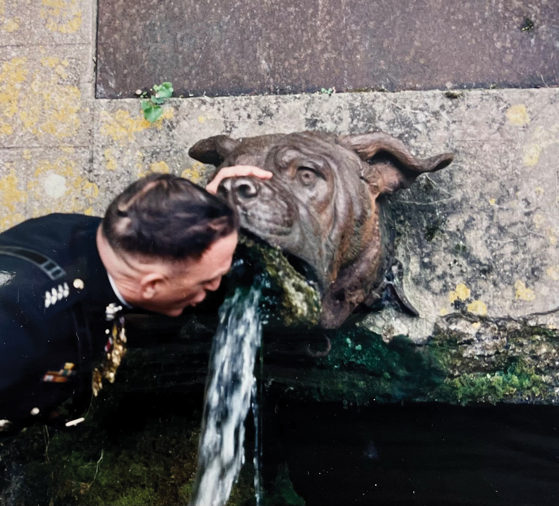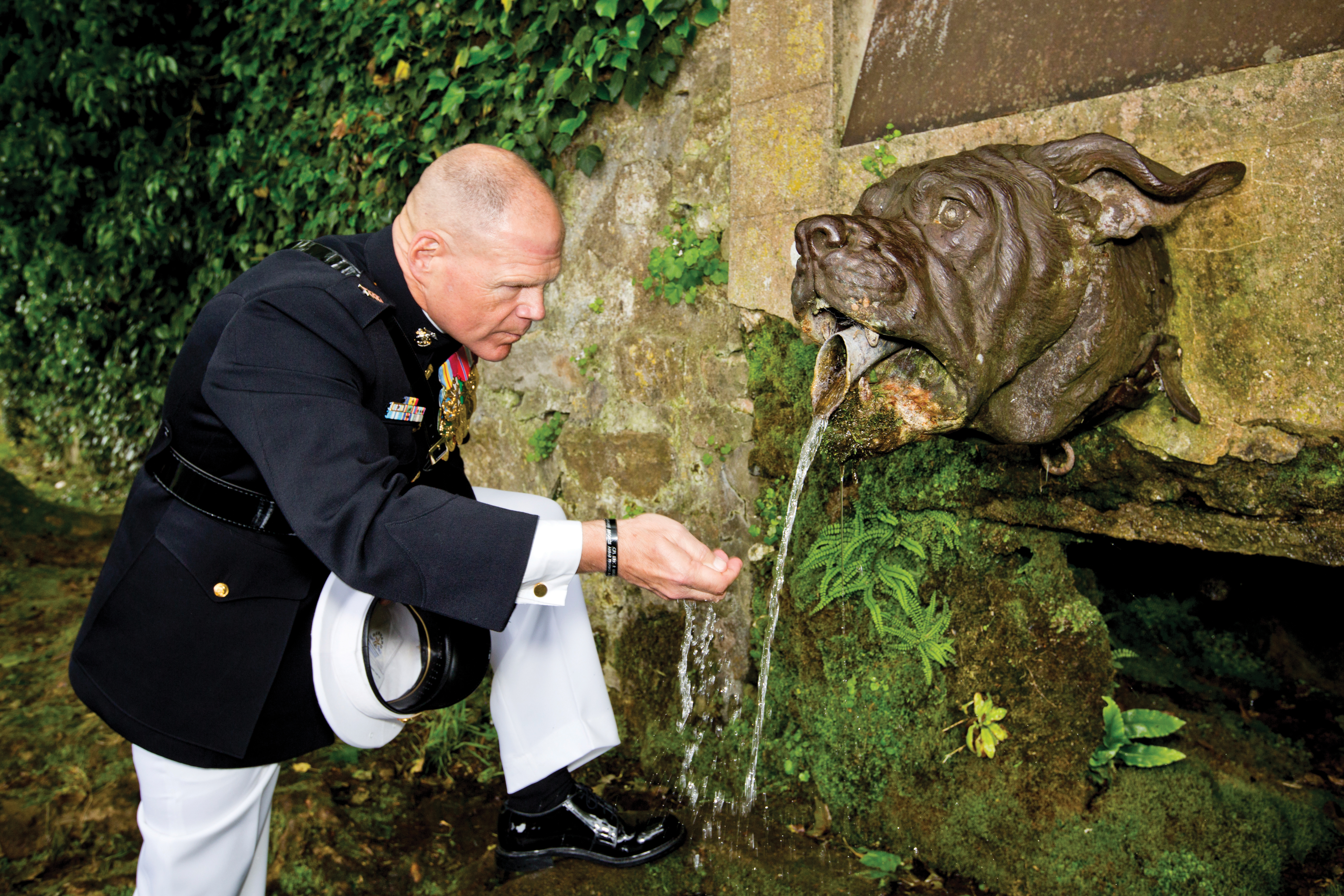 The Marine Corps released a photograph in June 2016 that was part of a series of images from Memorial Day events in Belleau Wood, France. The photograph captured a profoundly human moment: Commandant of the Marine Corps Robert B. Neller gazing contemplatively at a stream of water pouring from the mouth of a dog. His right hand was encircled by a memorial bracelet, an indication that he was carrying with him the memory of someone significant. From the view of an outside observer, it is evident that Neller was engaging in some type of ritual at this fountain, presumably tied to his status as a Marine. However, from the perspective of a pilgrimage researcher, not only was the nation’s top Marine receiving water from the mouth of a dog at a fountain in Northern France, he was also the embodiment of a pilgrim at a holy well. The image was so evocative that it launched a years-long quest to understand the significance of the Commandant’s visit and the parallel with pilgrims at other sacred wells.