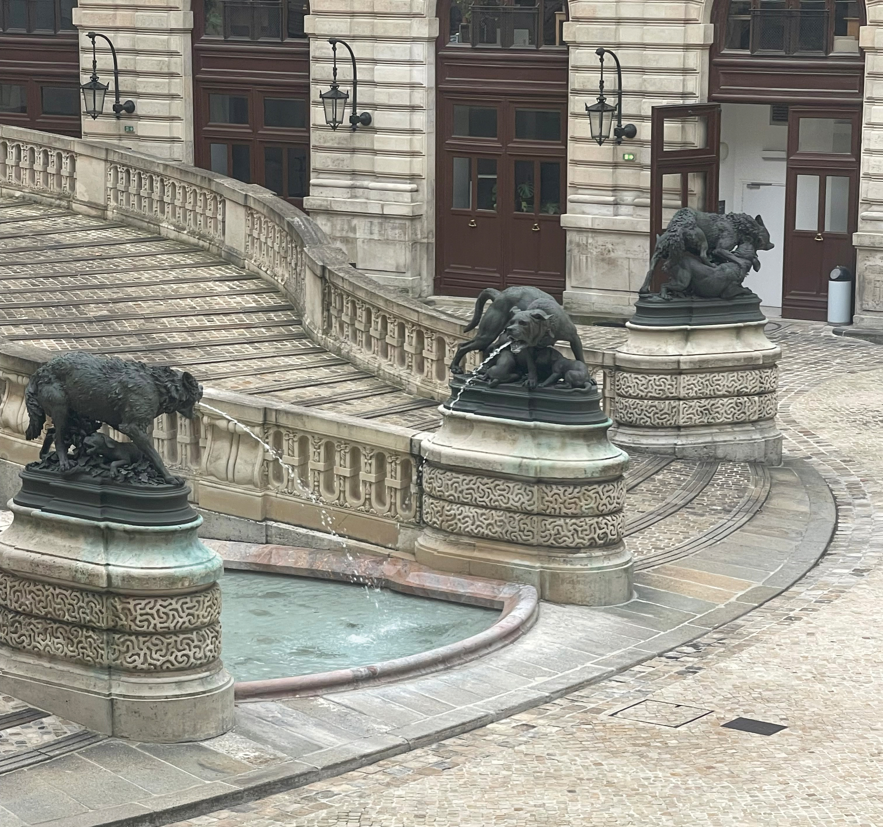 After Durenne purchased the rights to Rouillard’s Chienne et ses petits, the sculpture, commissioned by Napoléon III, was installed at the base of the staircase of the former imperial stables at the Louvre in 1859.[33] On 29 September 2024, the author photographed the original sculpture that was placed in 1859. It is not in the main Louvre collection, but rather a courtyard in which visitors are prohibited. Photographs of the sculpture were taken from the windows of the Denon Wing on two separate levels. The images depict the sculpture from different angles, with water spraying out of the mouth into a basin. This is the only sculpture in the series that acts as a fountain, and confirms that the design was such that a pipe could be inserted through the head.