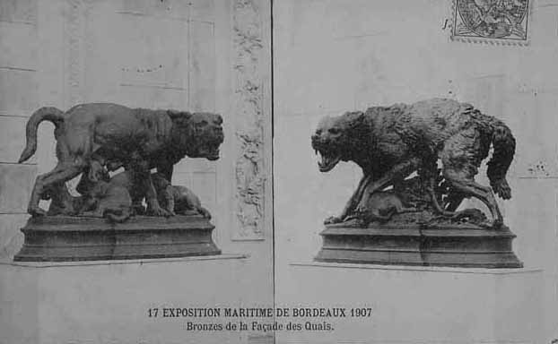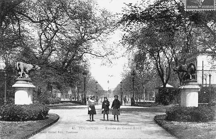 A postcard of the Toulouse Grand Rond park entrance shows Chienne et ses petits opposite the sculpture Loup et petit chien, 1893.
