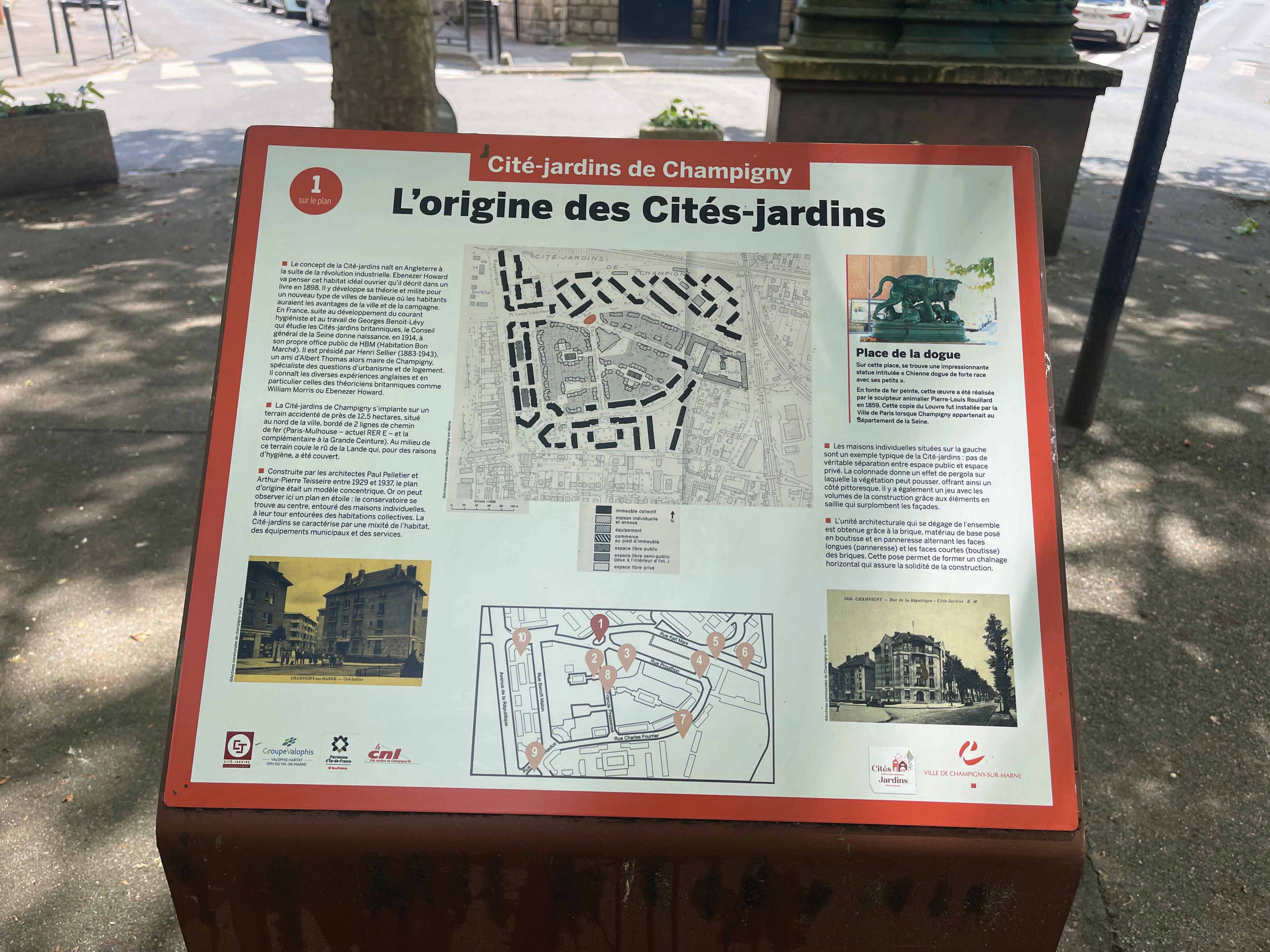 City park signage explaining the Chienne sculpture at Place de la Dogue, a small park in a traffic circle in Champigny, France.