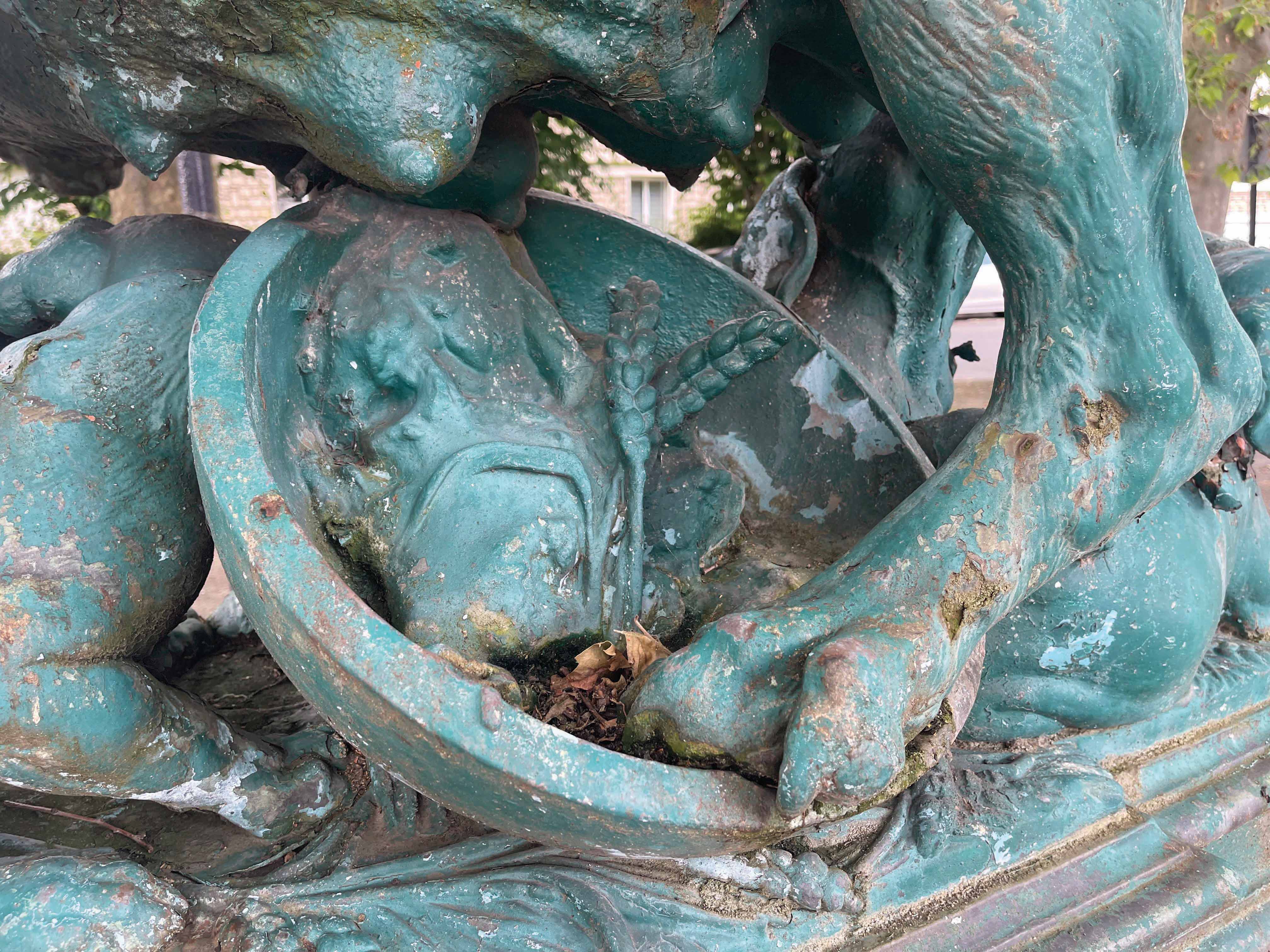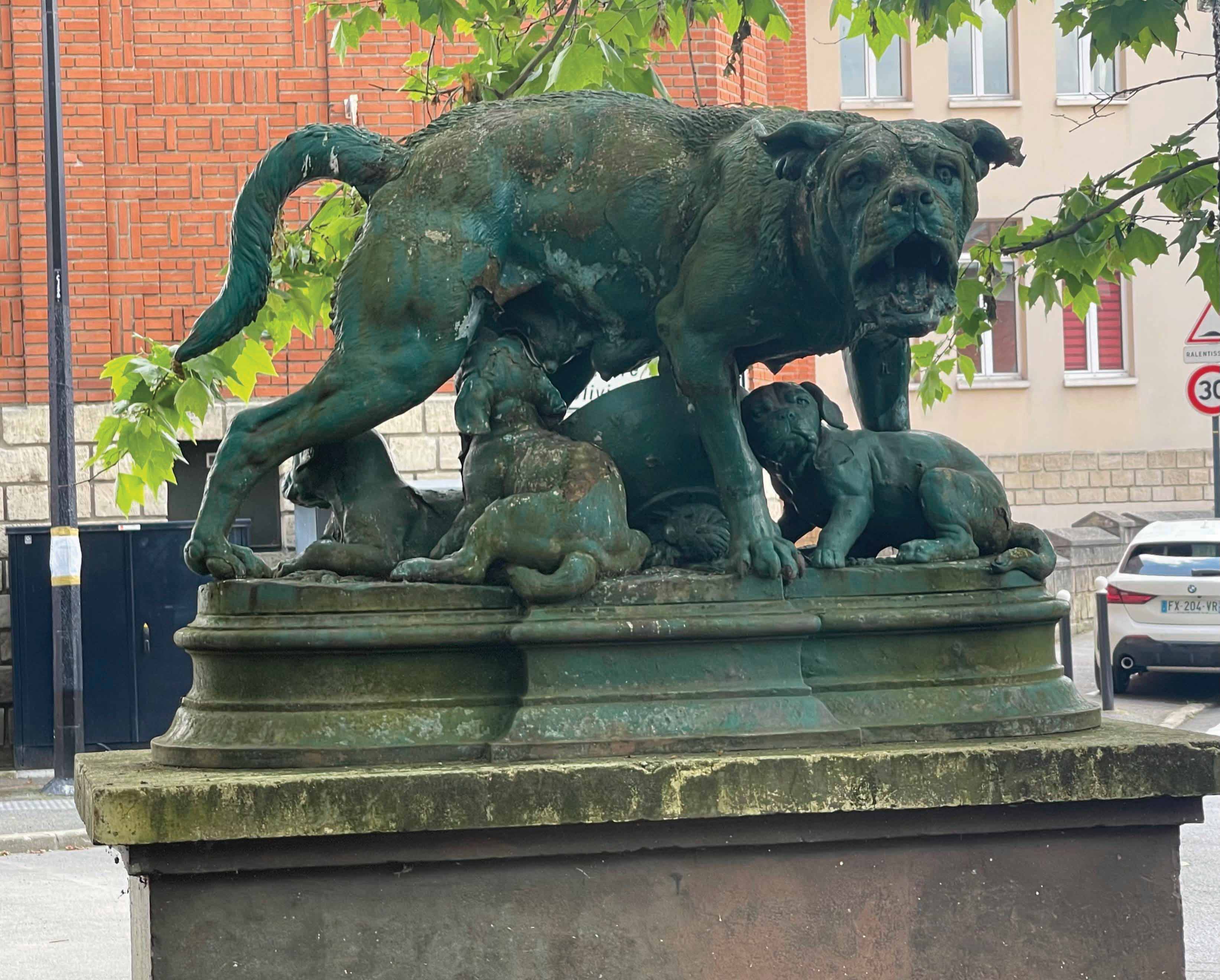 This sculpture was most useful for linking the Devil Dog fountain head to Rouillard and Durenne. The park is easily accessible from Paris and the sculpture could be examined up close. On 24 May 2024, the author traveled to the park, which is in the middle of a roundabout. There is an interpretive sign that confirms the sculpture was done by Rouillard and is a copy of the one at the Louvre. The sculpture was installed at this location by the City of Paris when Champigny belonged to the Seine Department. The author took detailed measurements of every aspect of the dog’s head so they could be compared with the fountain head in Belleau. In addition to the head, the sides and back of the sculpture were photographed and reveal three nursing puppies and a bowl into which the mother’s milk is dripping onto stalks of wheat.