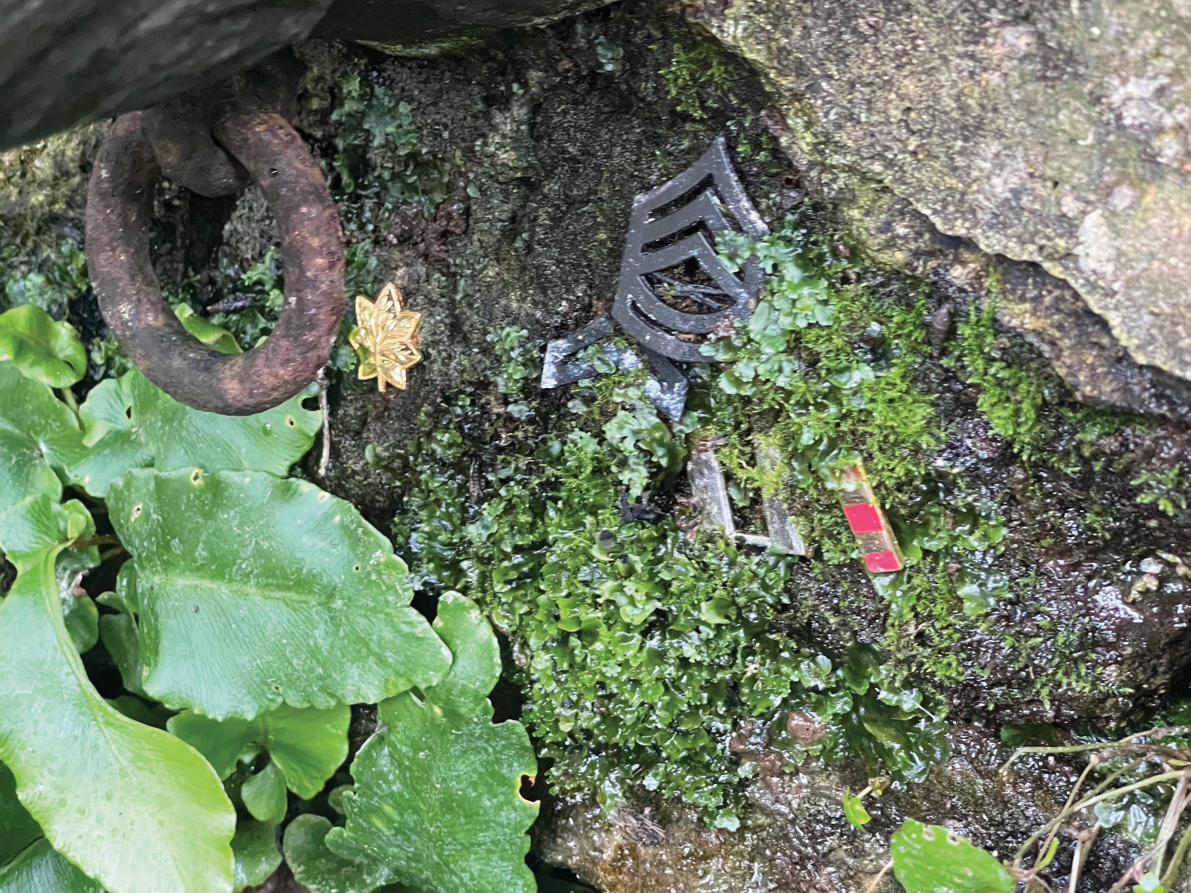 Uniform insignia left at the Devil Dog fountain by Marines.