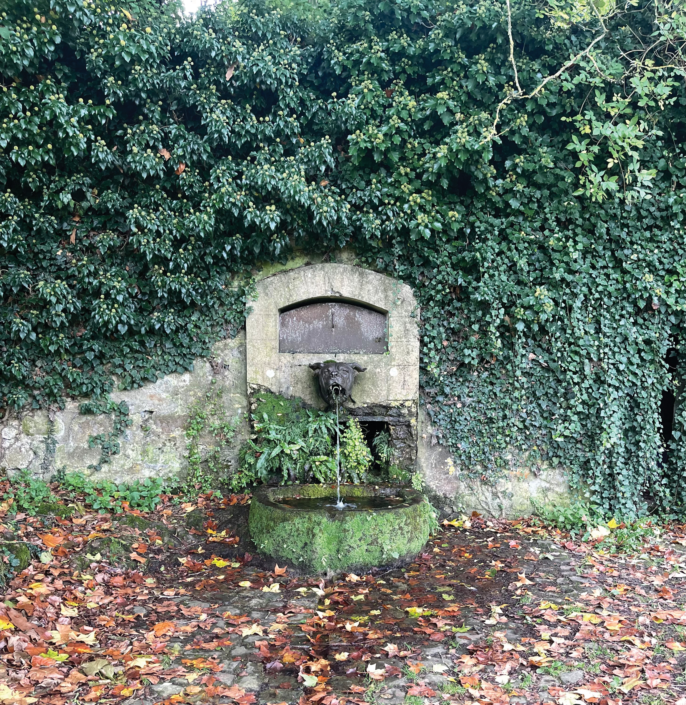 Relevant to the layered meaning(s) of the fountain is that beneath the surface of the battlescape is an aquifer, likely the impetus for human settlement in the area. The village’s name of Belleau may also be connected to this spring water as belleau means beautiful water. Moreover, the medieval-era church in Belleau was near the fountain, located here presumably due to the presence of a natural spring. The fountain is inside a gated courtyard on private property. It is slightly obscured when viewed from the road, but is clearly seen when one enters the metal gate. The fountain sits on the left side of the courtyard and has an arched stone frame with a similarly shaped metal door above the dog’s head. The head, approximately three feet from the ground, seems suspended on the wall, almost as a liminal portal between 1918 and the present. The head of the dog is nearly black in color and appears to be bronze, but is cast iron. At the base of the neck is a thick collar that fuses the head to the stone and one can sense that the dog’s head is missing its body. The stream of water that flows through a pipe in the mouth is like saliva spouting from somewhere beyond the head. The water exits into a moss-covered basin, an important feature that affords a structure on which to step to lean into the dog’s head. Below the head is a cavernous space that disappears into the stone wall and prompts curiosity about where it might lead, perhaps a gateway into the past or an otherworldly place. The dog head seamlessly merges into the Belleau Wood narrative and battlefield, which was a place of brutal violence, but also the scene of a grand origin story: Belleau Wood gave birth to the Devil Dogs. This birth narrative is triple: the battle birthed the modern institution of the Marine Corps; individual Marines, who fought or died in the battle, birthed “the exemplar Marine”; and the woods, as an earthen womb, birthed immortality.