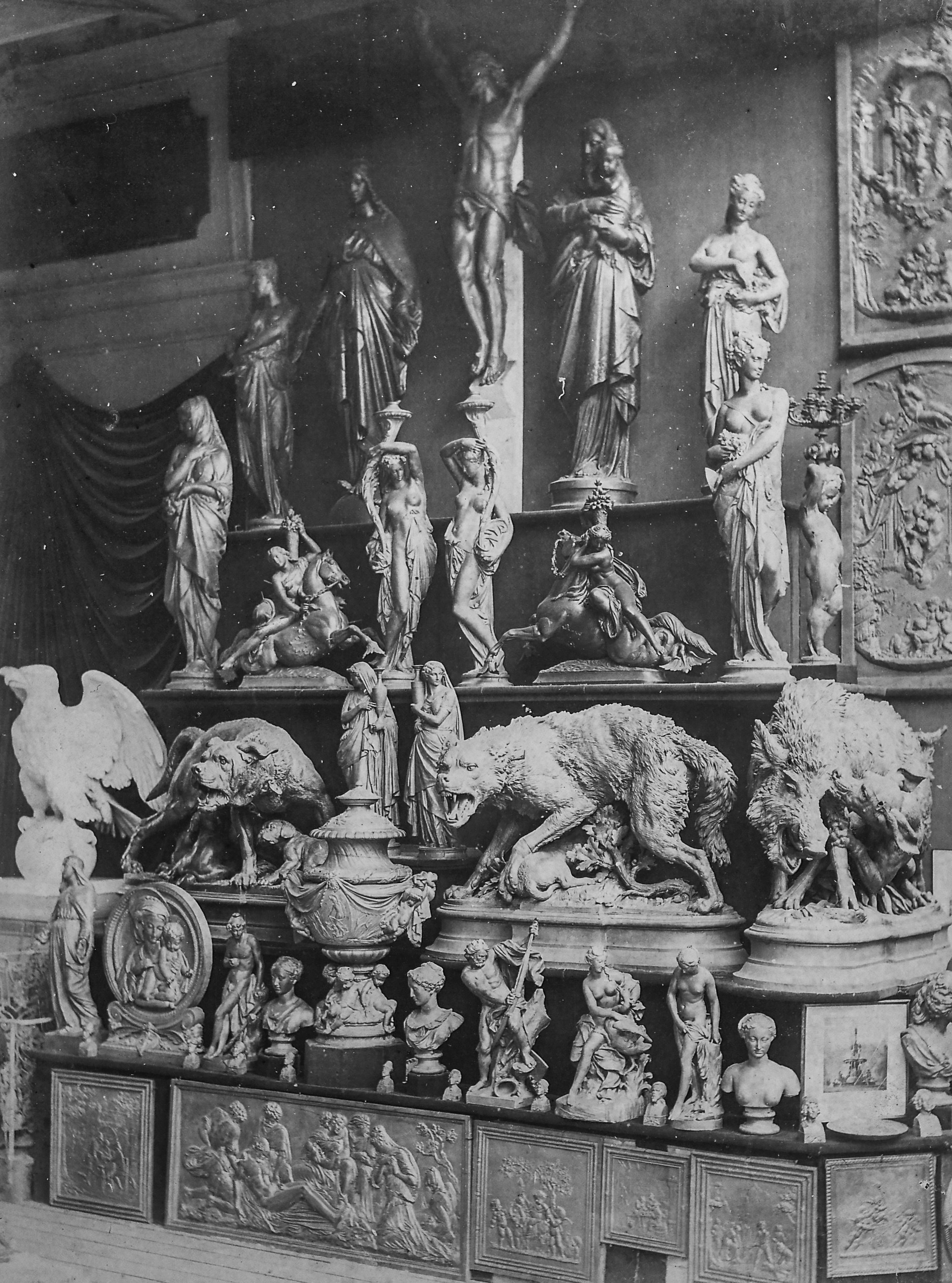 Antoine Durenne’s exhibition stand in London, 1862, displaying sculptures, including Pierre Louis Rouillard’s Chienne et ses petits (left).