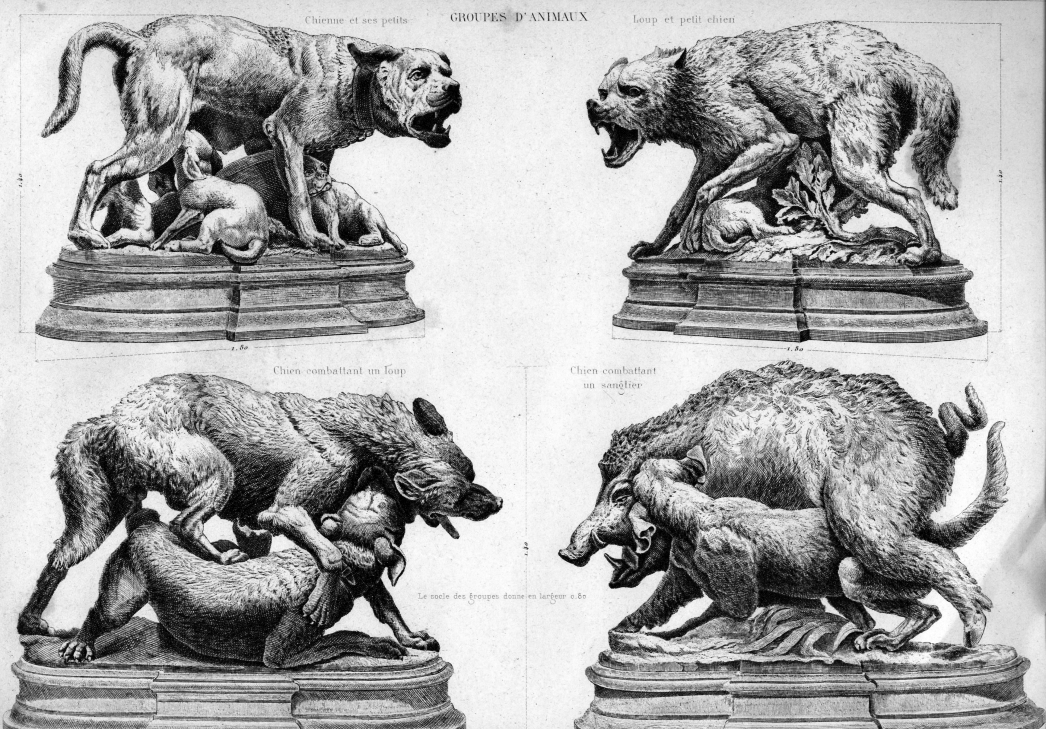 Groupes d’Animaux, 1867, showing an illustration of the sculpture Chienne et ses petits (top left), along with others.