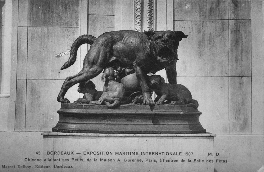 An exhibition postcard of Durenne’s Chienne et ses petits, reading: Bordeaux — Exposition Maritime Internationale, 1907.