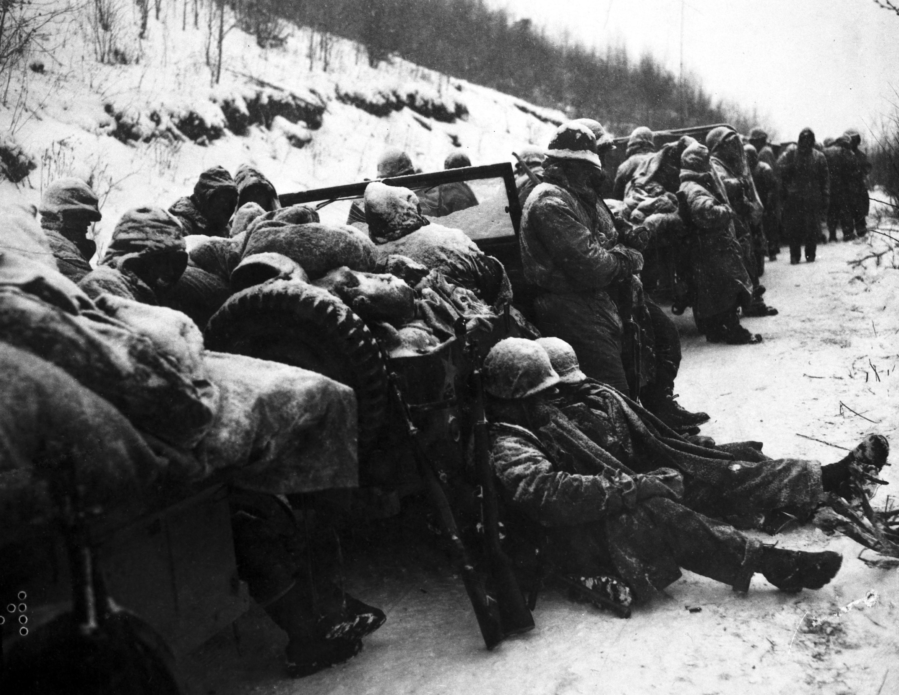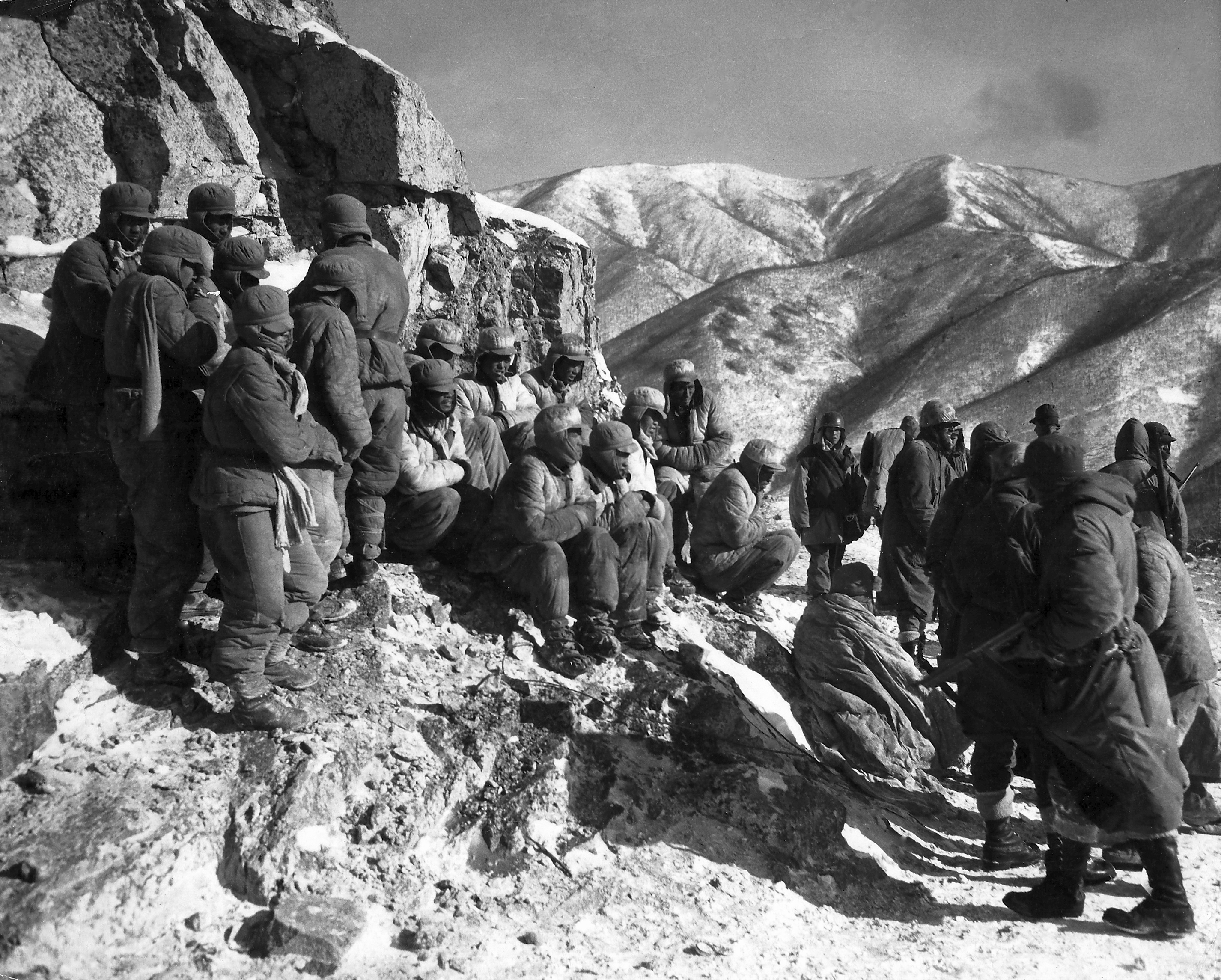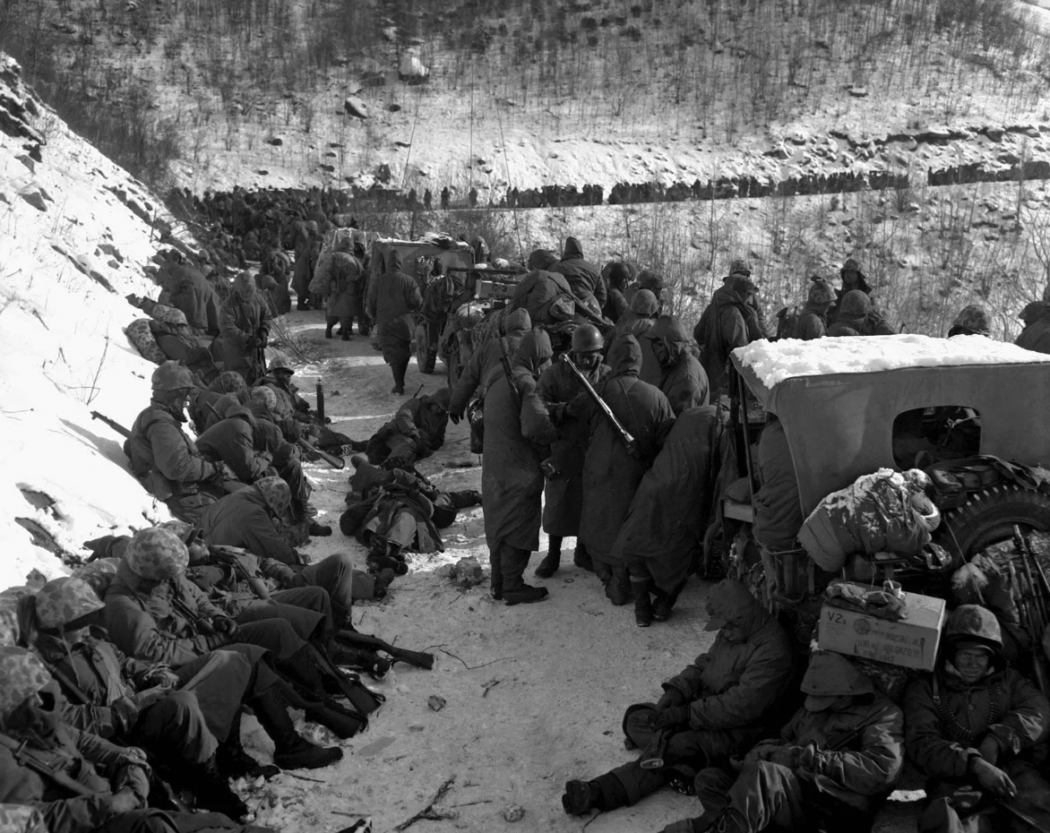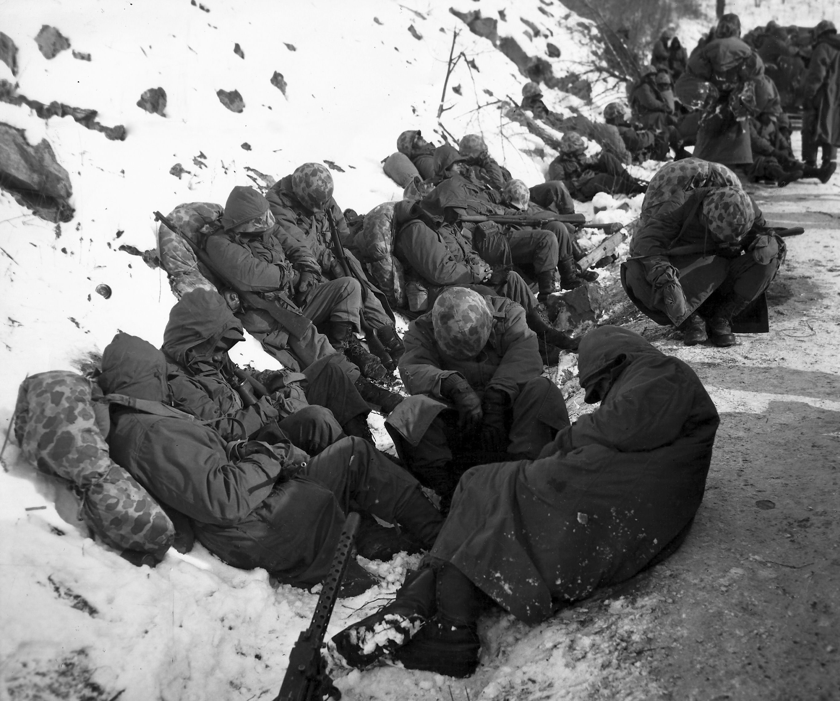 Enduring bitter cold and relentless combat, leathernecks of the 7th Marines take a break during their withdrawal from the Chosin Reservoir.