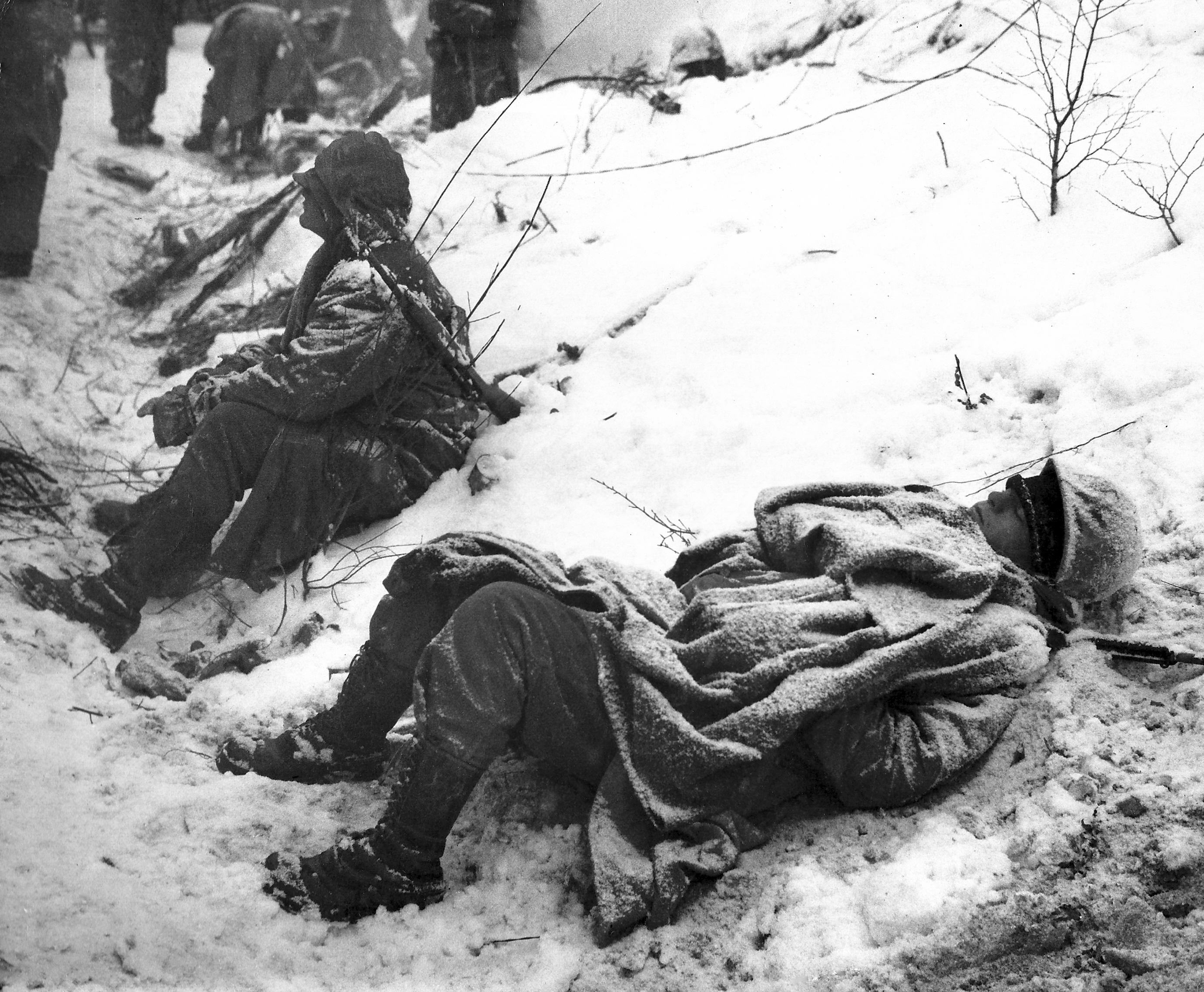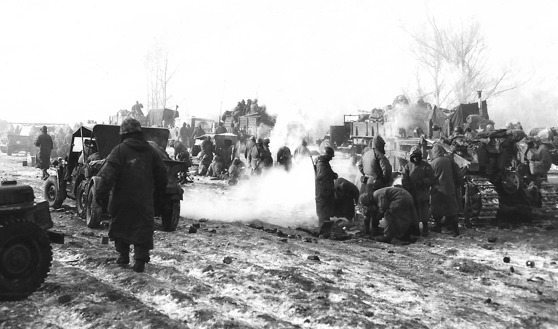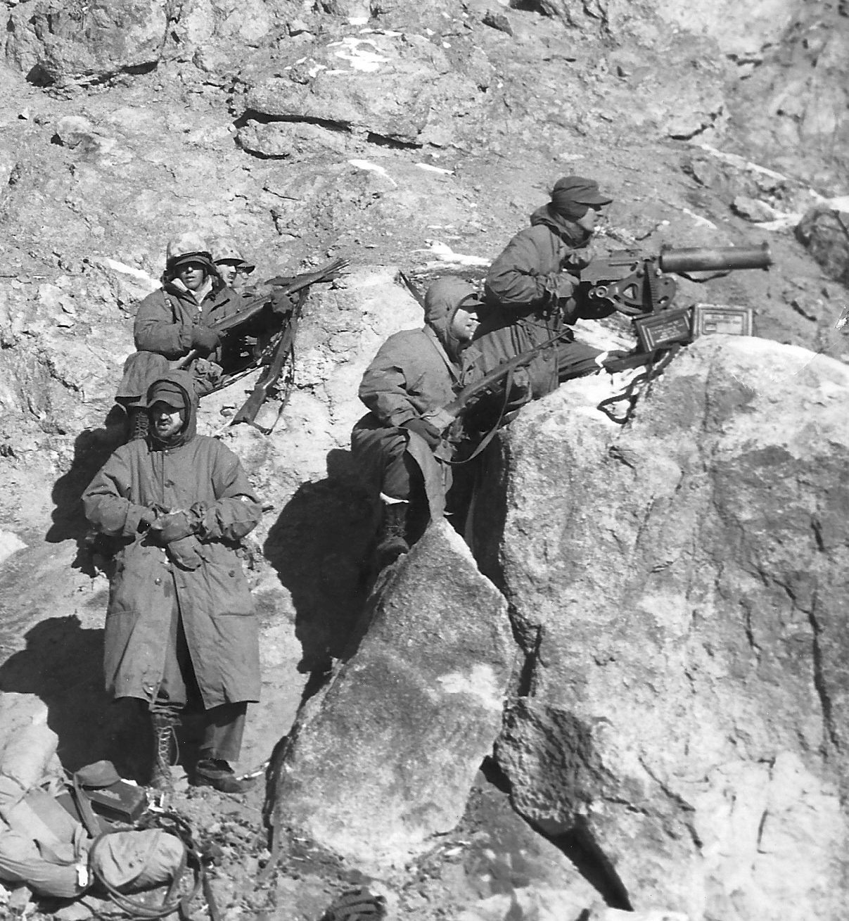Enduring bitter cold and relentless combat, leathernecks of the 7th Marines take a break during their withdrawal from the Chosin Reservoir.
