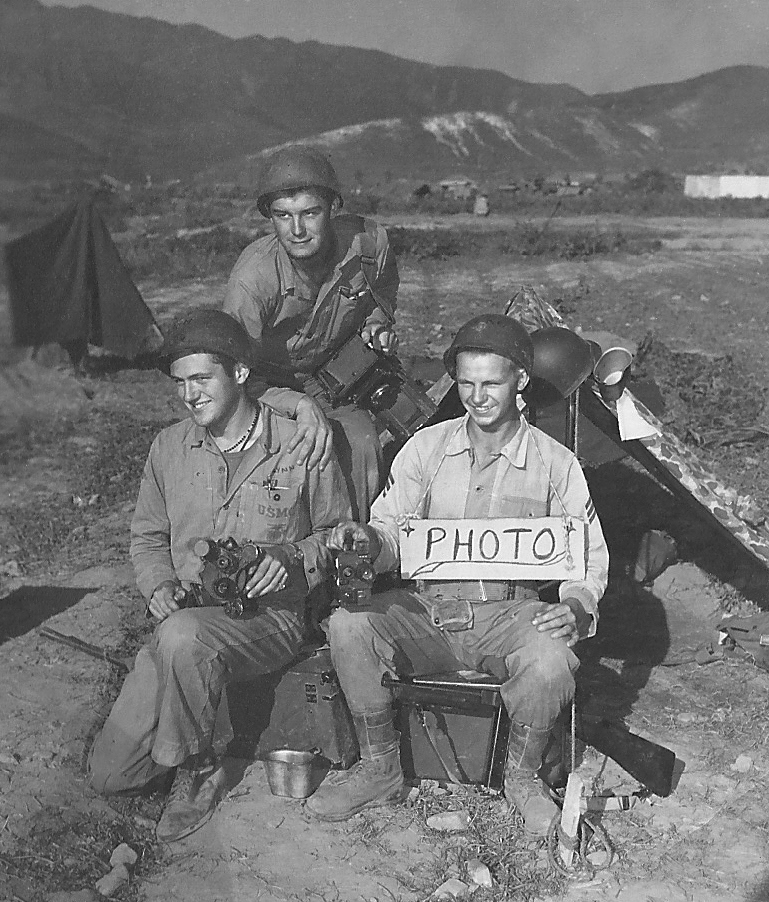 The first three Marines to capture the Korean War on film. Left to right: combat cameraman Cpl John Flynn, combat photographer Sgt Frank C. Kerr, and combat cameraman Cpl Jake McKay.