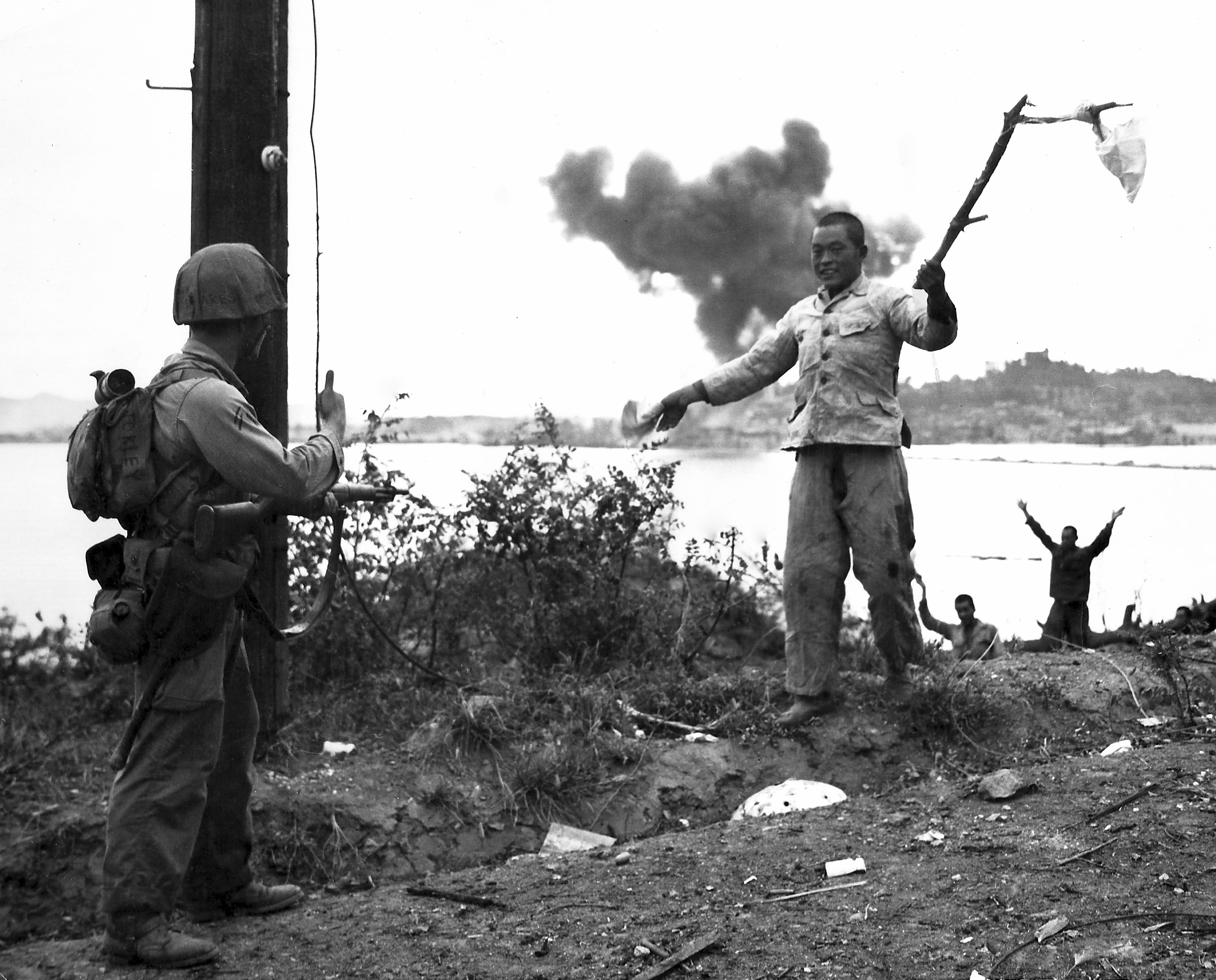 A North Korean soldier waves a white cloth of surrender as he leads his companions into the custody of U.S. Marines on Wolmi-do Island, gateway to Inchon, 15 September 1950.
