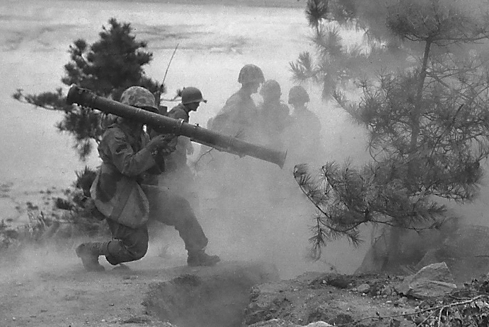 Marine infantry stand by while their bazookaman fires a round into an enemy bunker on Wolmi-do.