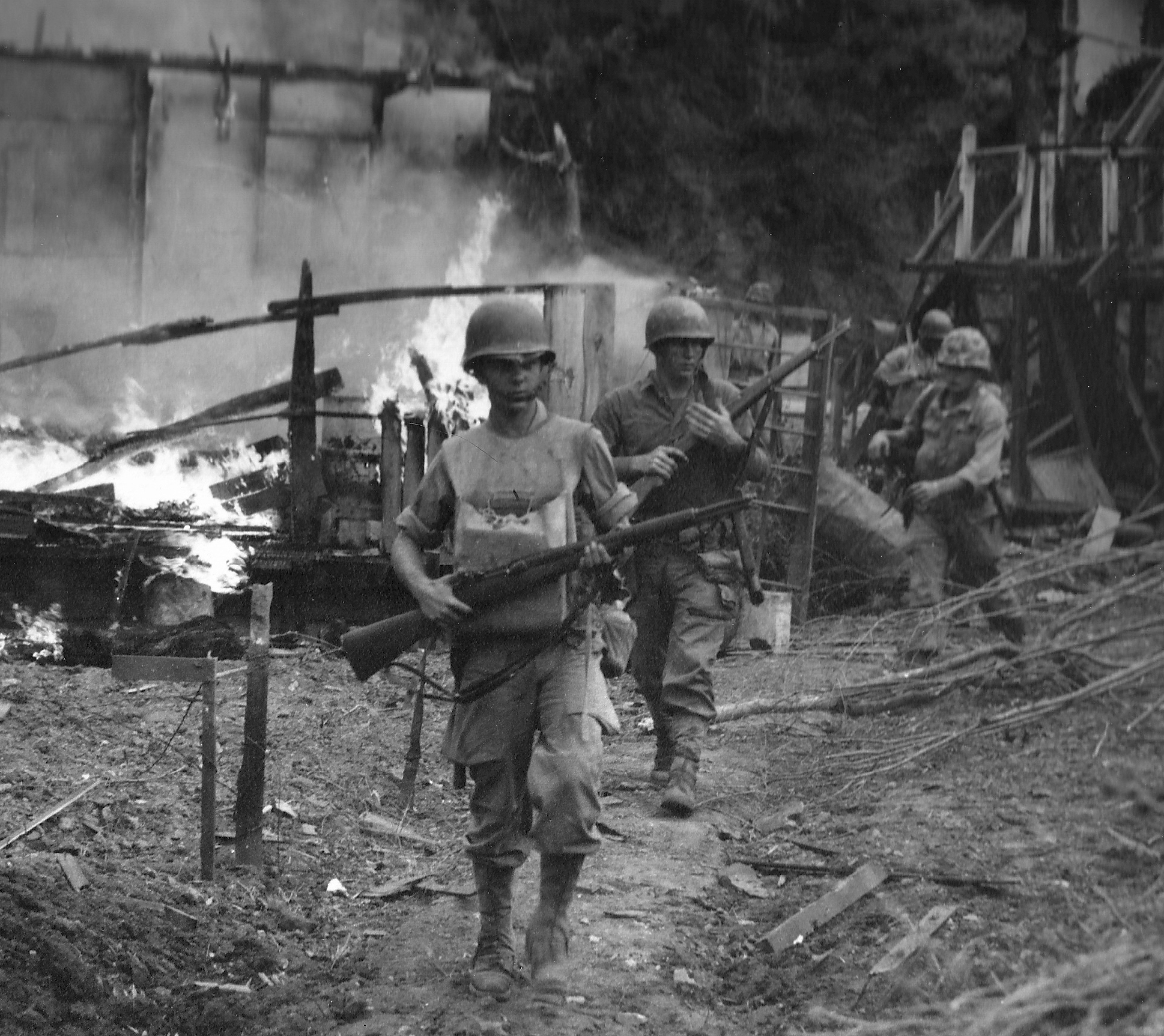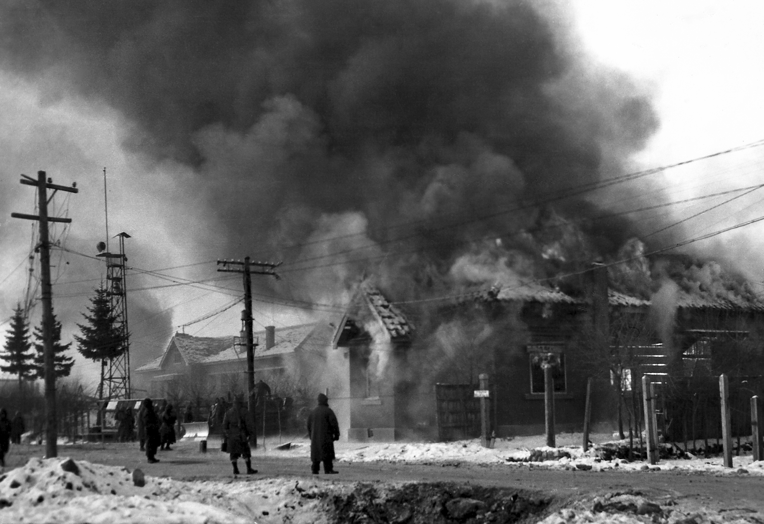 Before withdrawing, men of the 1st Marine Division burn anything that might be of value to Communist forces in the North Korean town of Hagaru.