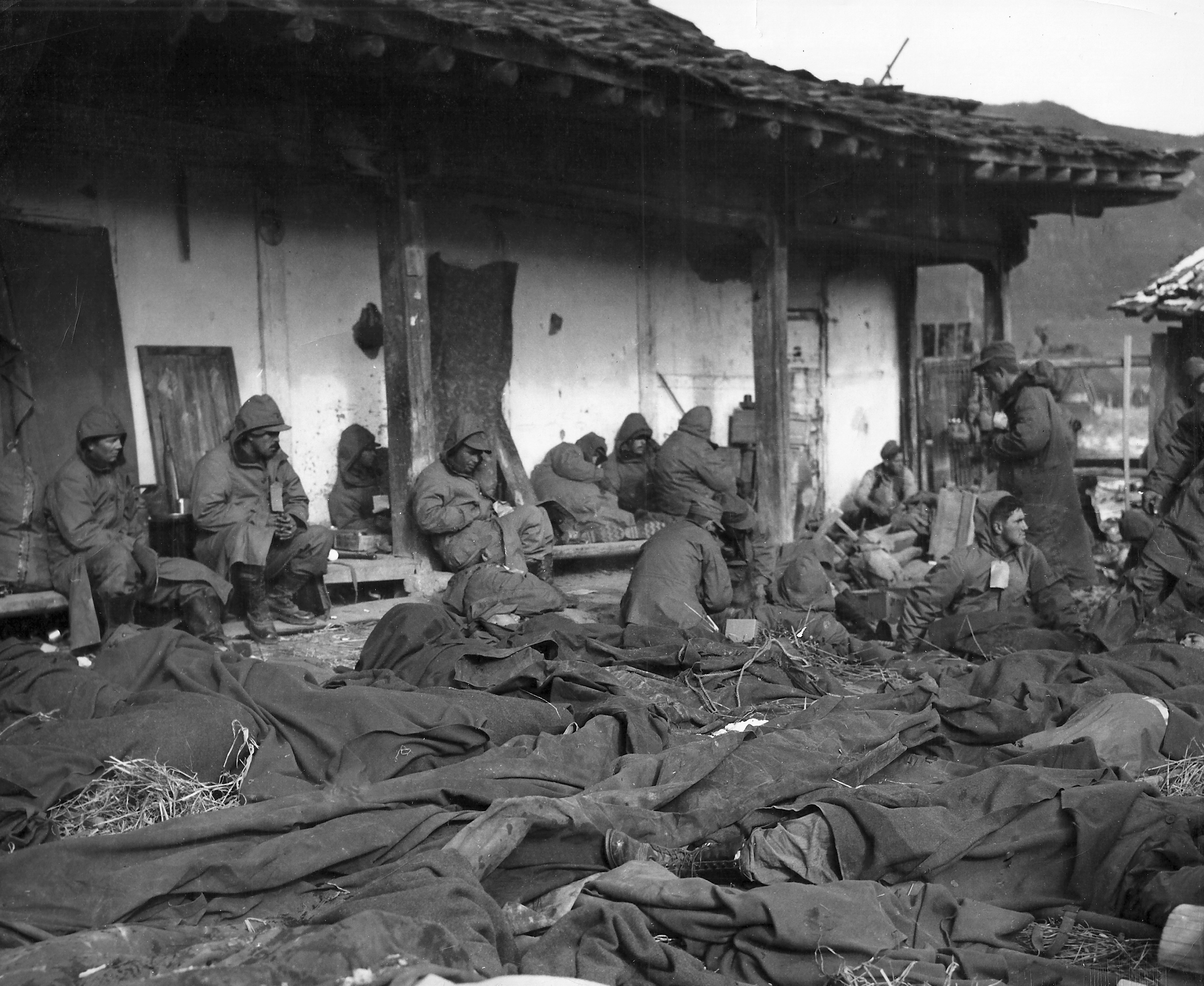 U.S. Marine casualties assemble at Yudam-ni for medical aid and evacuation to hospitals behind the fighting fronts, 28 November 1950.