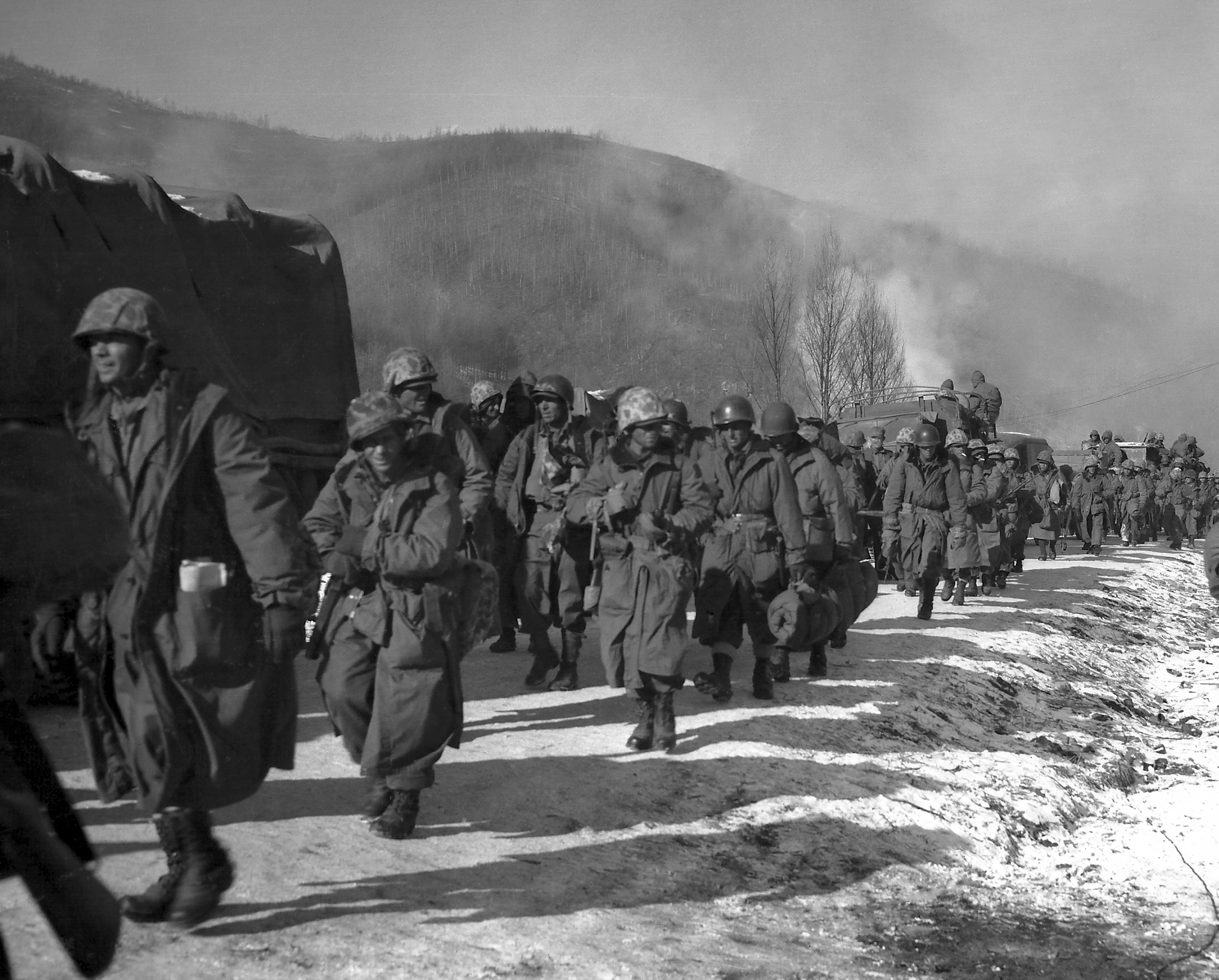 Yudam-ni, 1 December 1950. Taking their wounded and their equipment, 5th and 7th Marines begin their long march toward Hagaru-ri.