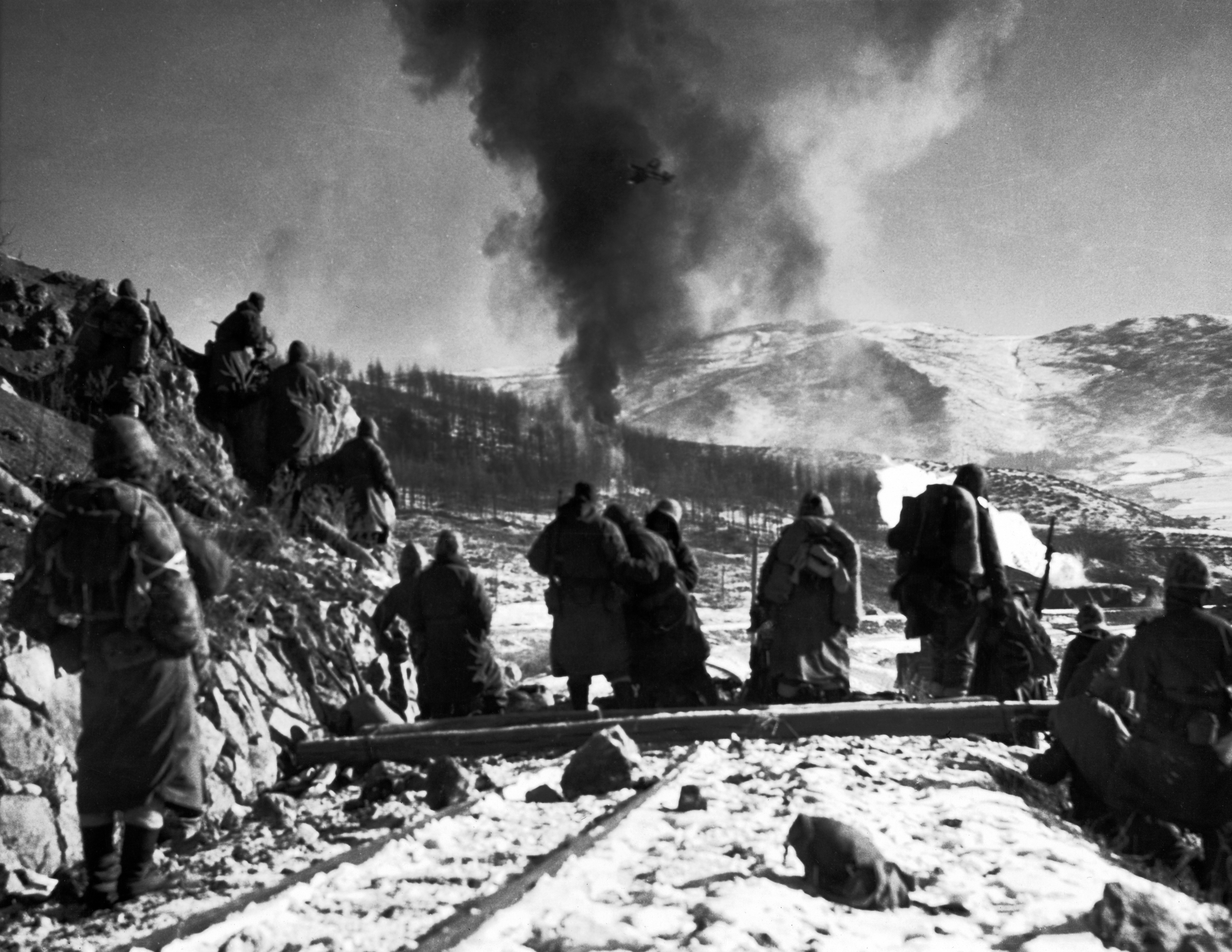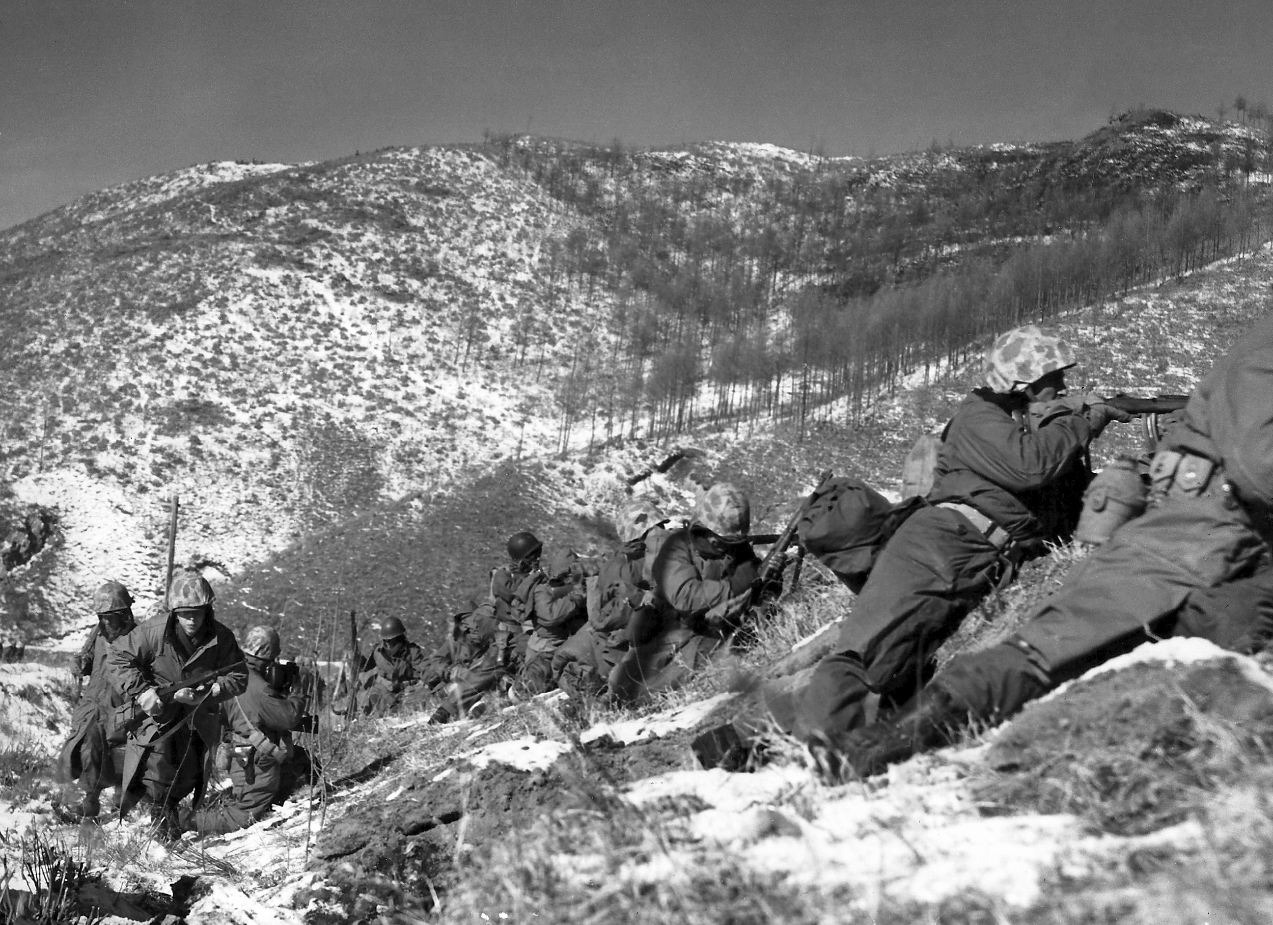 The infantrymen of 1st Marine Division take to a rugged hillside to engage Chinese troops who have set up a roadblock on the road from Hagaru-ri to Koto-ri, 6 December 1950.