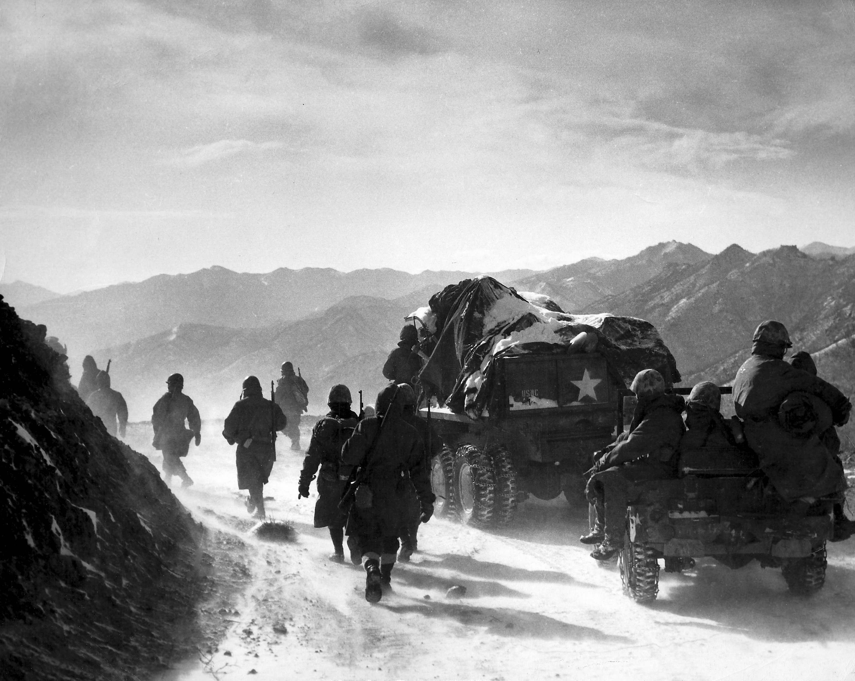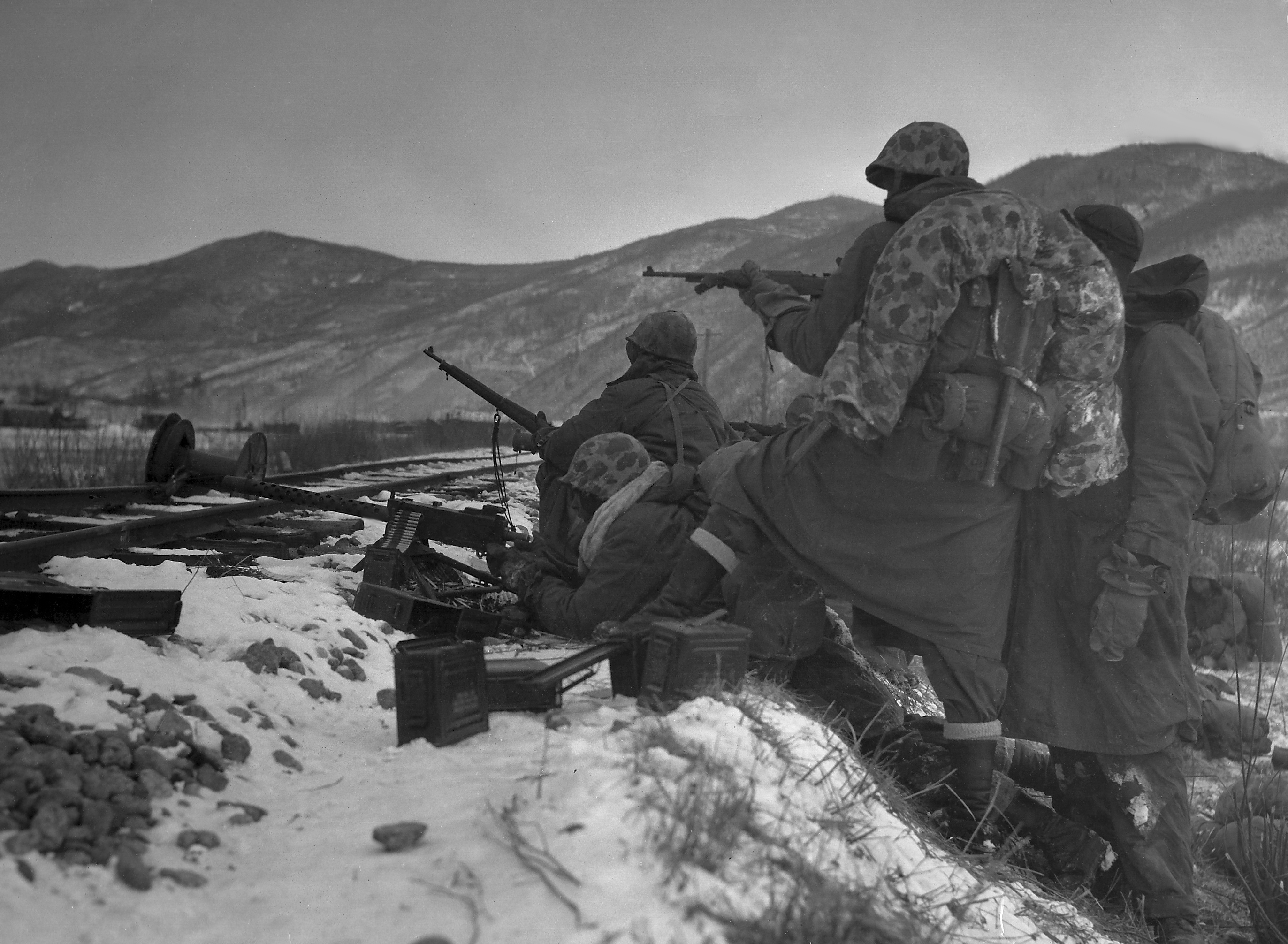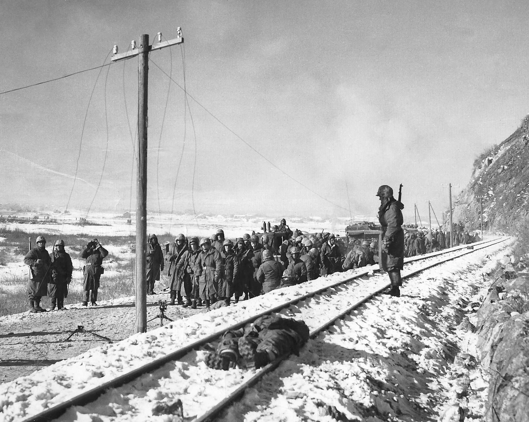 Chosin Reservoir, ca. December 1950. Marines of the 5th and 7th Regiments halt on the main supply route between Yudam-ni and Hagaru-ri, while lead units clear the ridges of enemy soldiers.