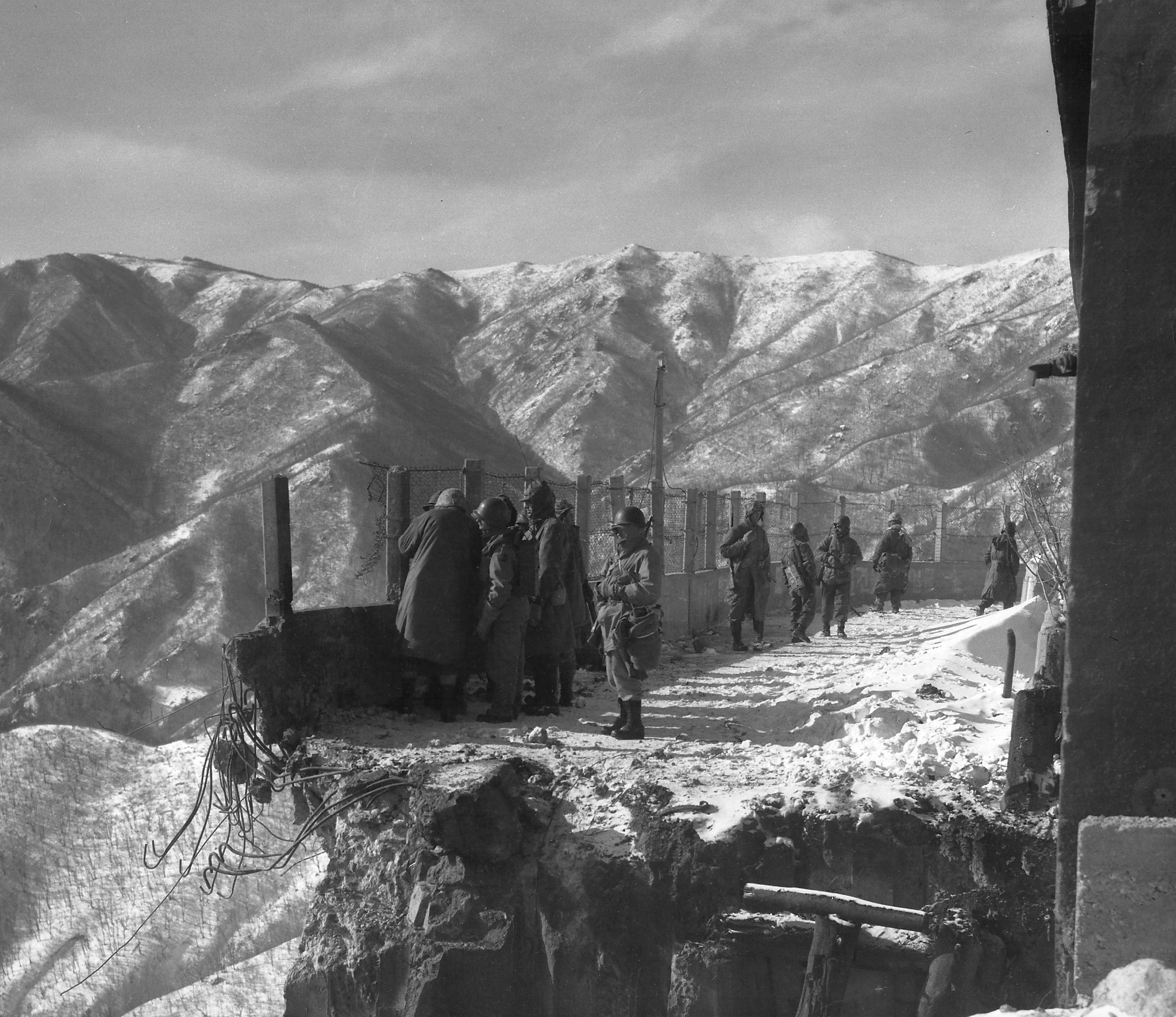 Men of the 7th Marines stand guard over a destroyed bridge at Funchilin Pass, which temporarily halted the division’s withdrawal from Koto-ri, 9 December 1950.