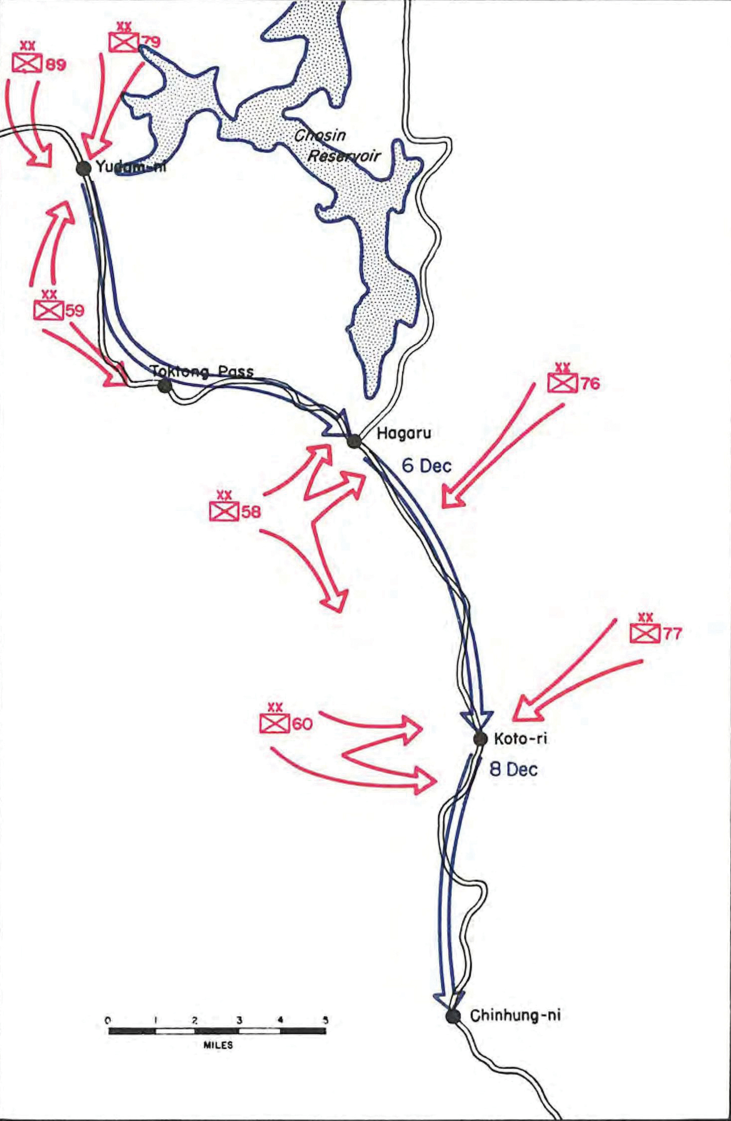 1st Marine Division’s route of withdrawal from the Chosin Reservoir, indicating Chinese Army points of attack, 27 November–11 December 1950.