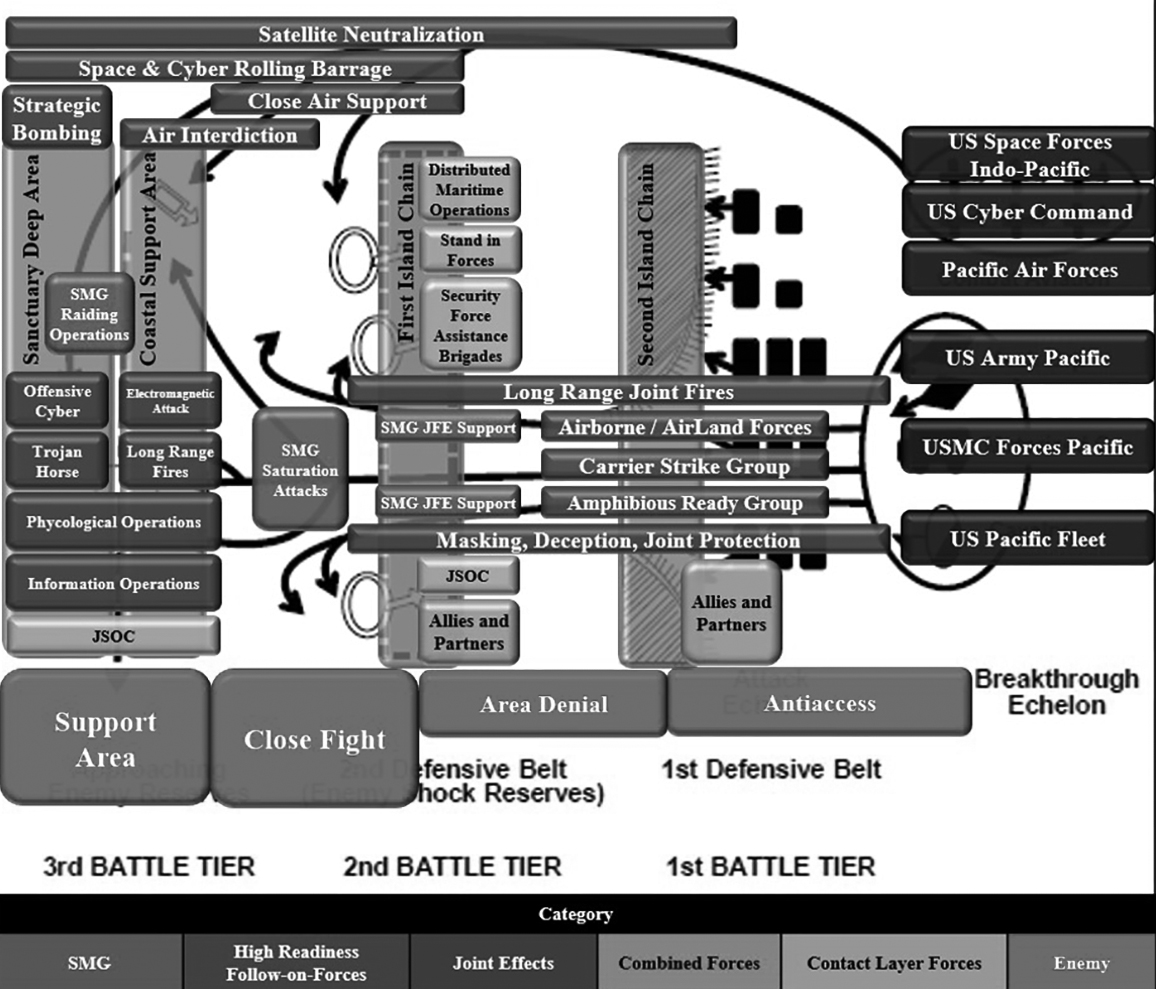 Figure 3 is an example Joint task force penetration of the PRC’s A2/AD system in the Western Pacific, overlayed on Isserson’s deep operation concept.27 Note SMG saturation attacks, raids, and Joint forcible entry operations disintegrate the PRC’s A2/AD systems and enable Joint task force freedom of maneuver.