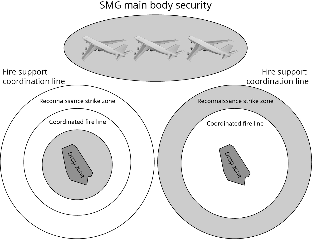 Top: A small maneuver group serves as main body security of transport aircraft. Left: A small maneuver group advance guard neutralizes enemy forces in the vicinity of a planned drop zone and confirms pre-assault fires effects. Right: A small maneuver group establishes an aerial minefield to protect an airborne lodgment.