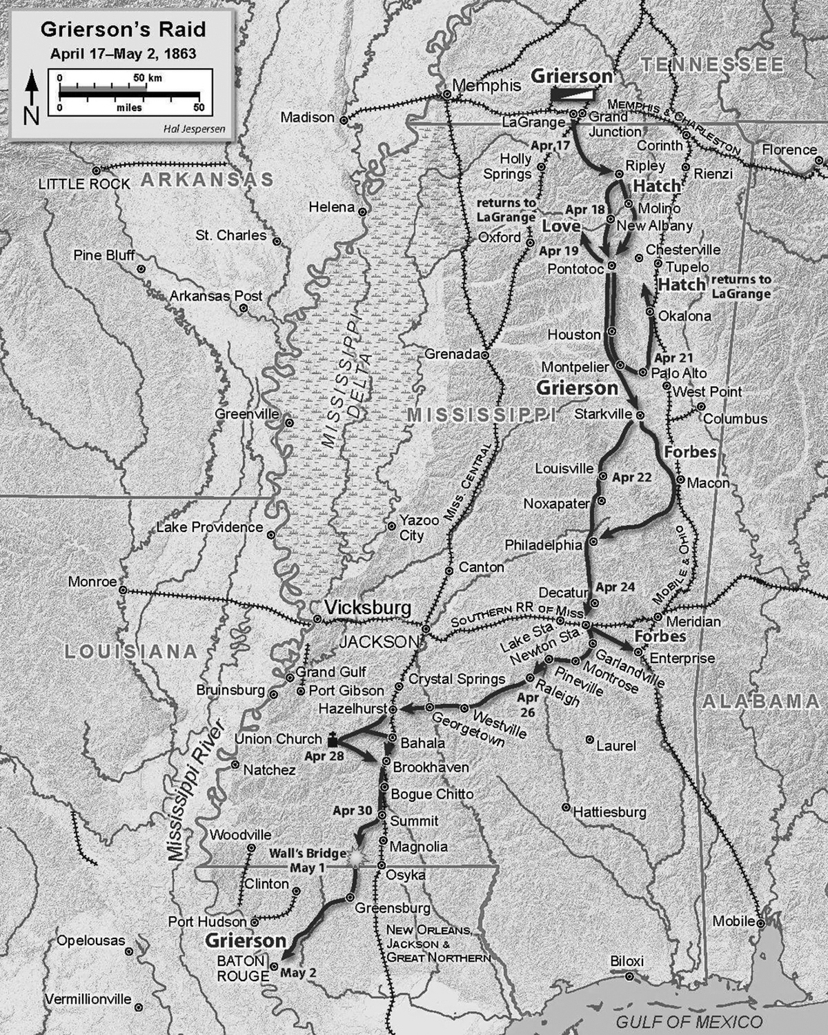 In April 1863, Grant launched a second Vicksburg Campaign, this time seeking to cross the Mississippi River south of the fortress. On 17 April, he dispatched a brigade of 1,700 cavalry and six small guns under Colonel Benjamin H. Grierson with the dual purposes of distracting Pemberton from Grant’s movement and fixing Confederate forces, primarily their cavalry, away from the Union crossing site. Grierson avoided Confederate strengths and attacked weaknesses. He routinely detached subordinate elements to move on separate axes and made numerous feints to confuse the Confederates as to his real objective. He also employed an advanced reconnaissance force wearing Confederate uniforms to provide early warning of enemy forces.6