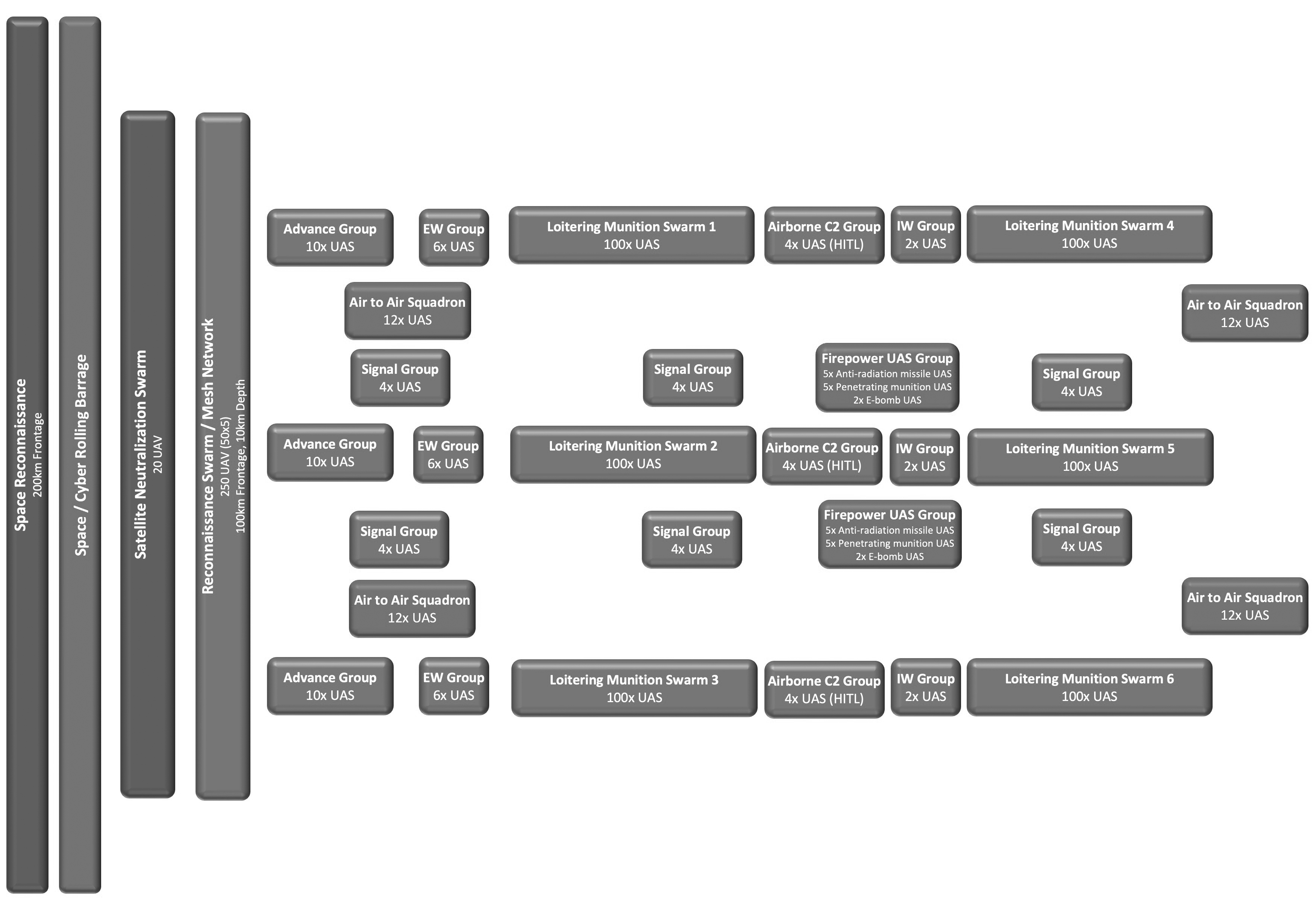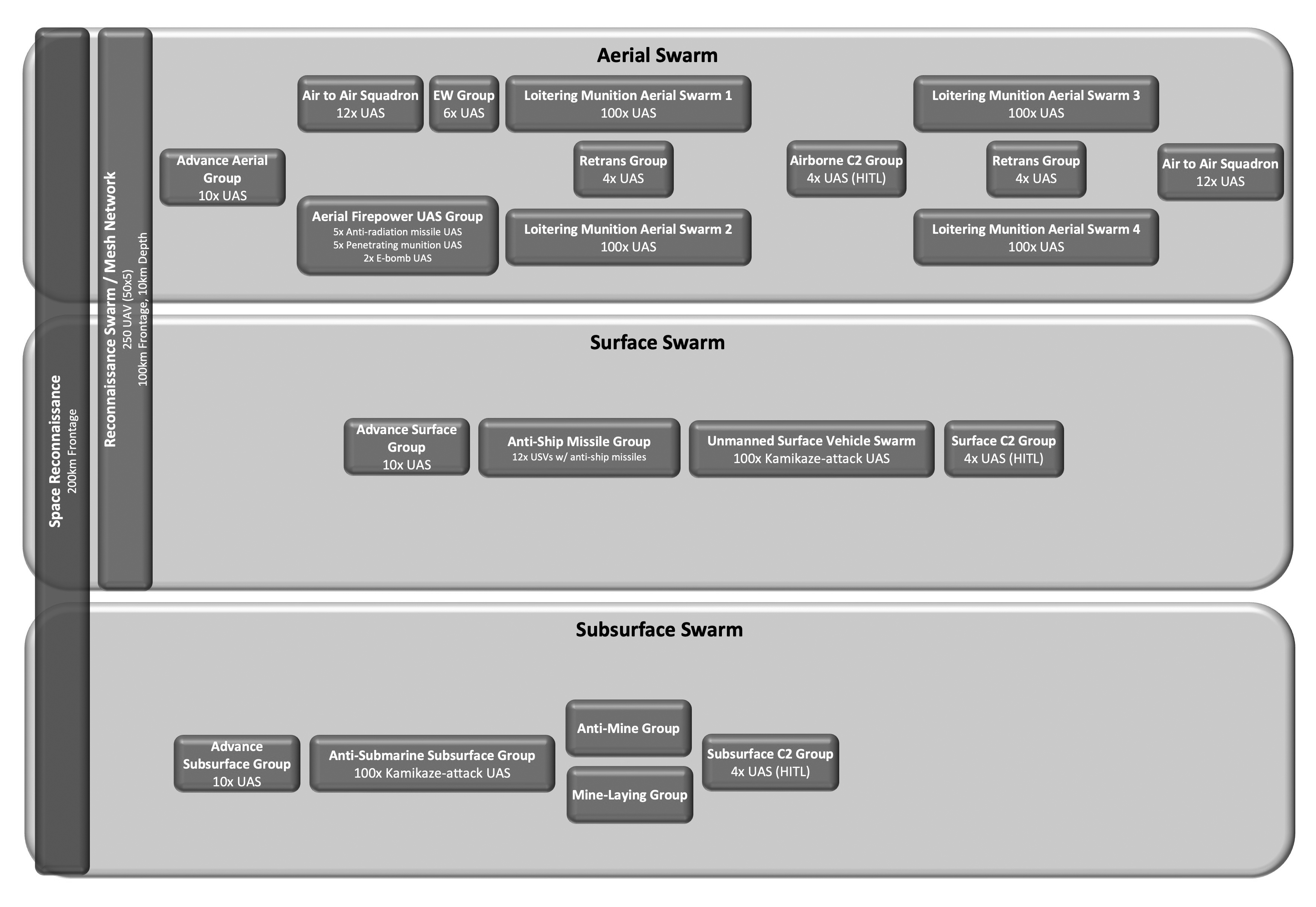 The subgroups are broken down into two categories: swarm groups and enabling groups. Swarm groups are the small maneuver group’s main firepower: mass-produced UCVs employed in kamikaze swarm tactics or aerial and subsurface minefields to deny enemy maneuver. Enabling groups are more exquisite UCVs that use combined arms effects to allow the swarm groups to accomplish their assigned task. The subgroups are as follows: