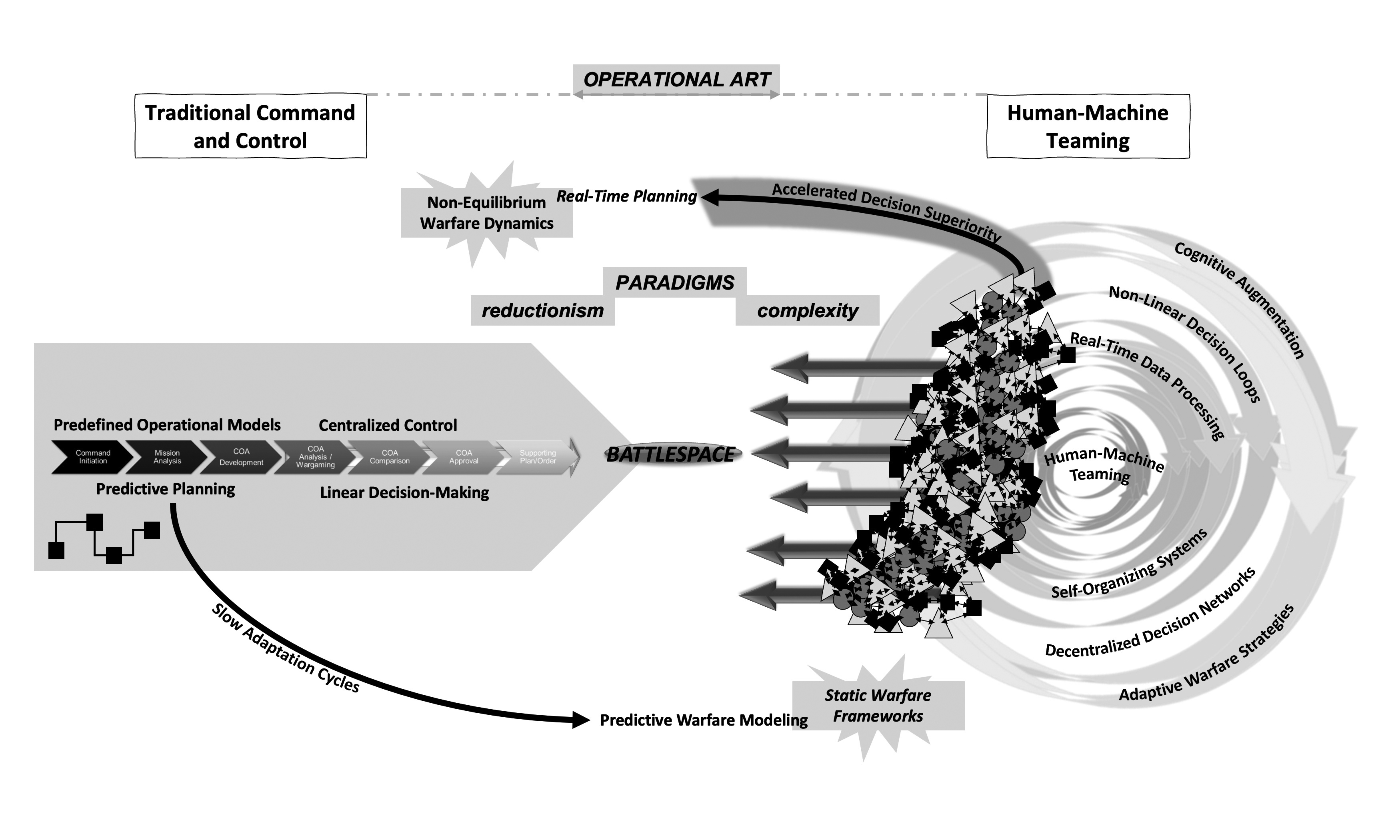 Source: based on Ben Zweibelson, “Breaking the Newtonian Fetish: Conceptualizing War Differently for a Changing World,” Journal of Advanced Military Studies 15, no. 1 (Spring 2024), https://doi.org/10.21140/mcuj.20231501009; Christopher R. Paparone, “How We Fight: A Critical Exploration of U.S. Military Doctrine,” Organization 24, no. 4 (2017): 516–33, https://doi.org/10.1177/1350508417693853; Thom Hawkins, “We Are All Agents: The Future of Human-AI Collaboration,” Modern War Institute, 28 August 2024; and J. Caballero Testón, ”The Role of Automated Planning in Battle Management Systems for Military Tactics,” Expert Systems with Applications 297 (2025), https://doi.org/10.1016/j.eswa.2025.129259