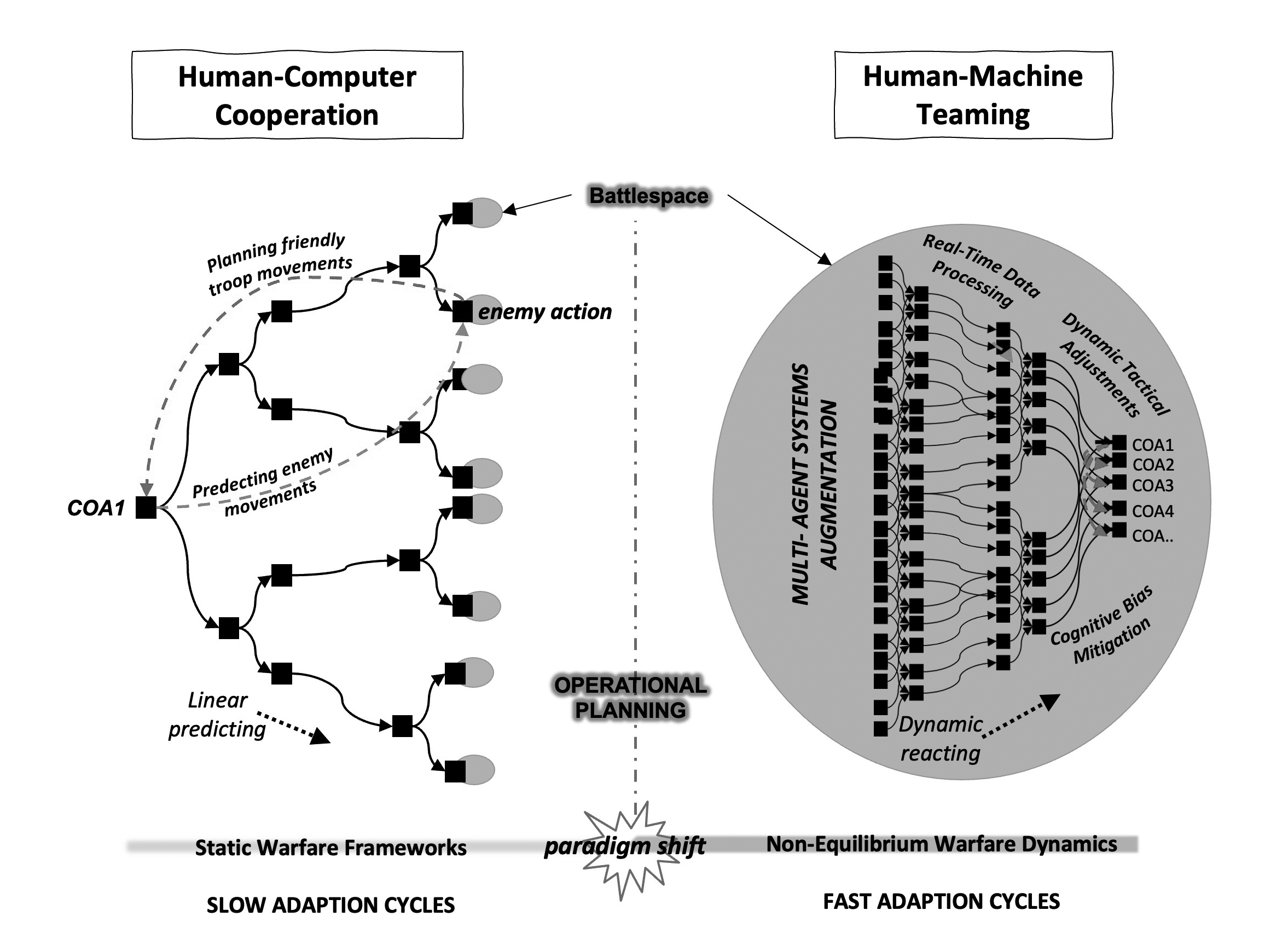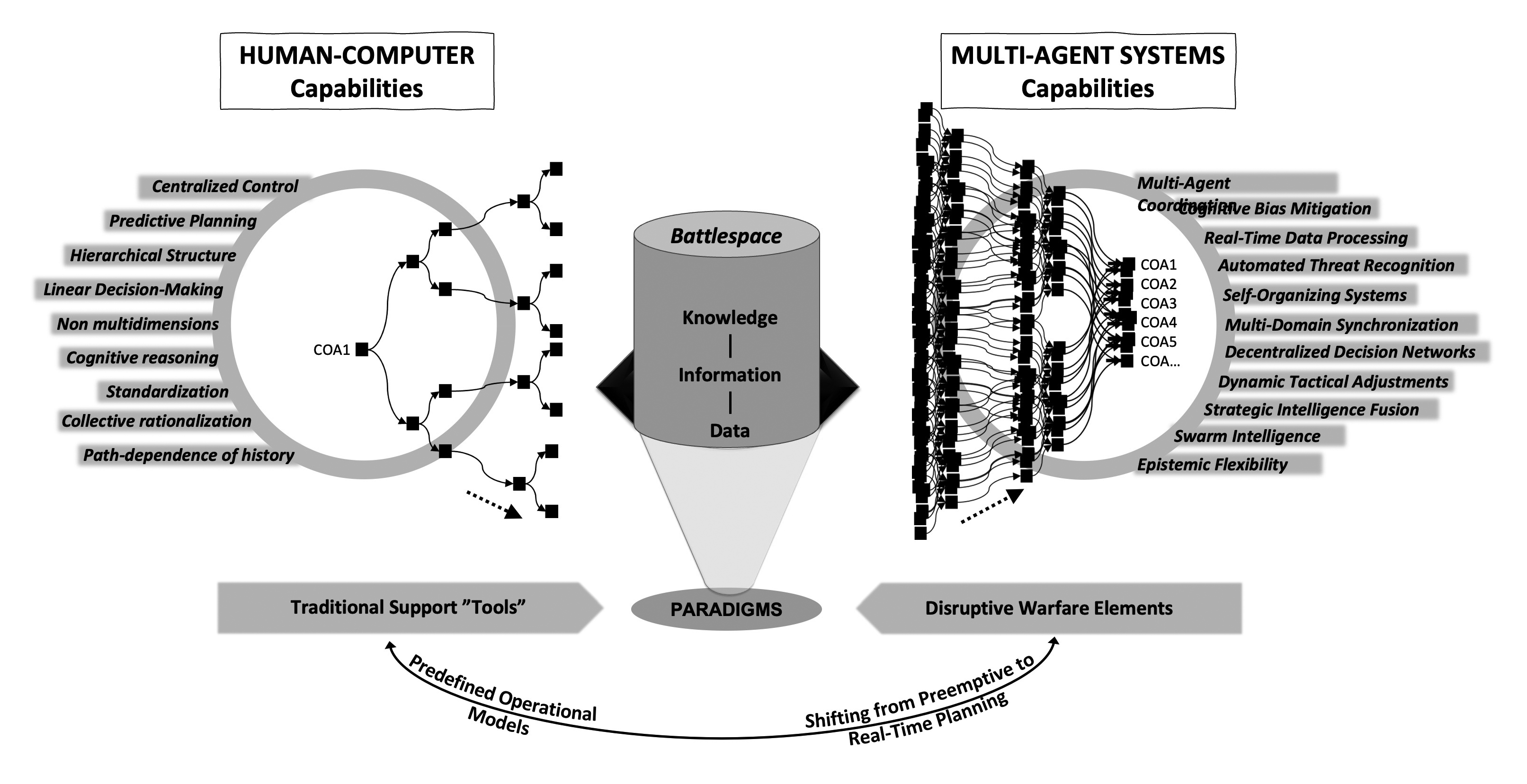 Figure 2 illustrates a paradigm shift that will be driven by multiagent systems. Real-time operational planning becomes feasible through data automation, multiagent network intelligence, and enhanced human-machine integration. In traditional, static operational planning, enemy actions must be predicted well in advance, as dynamic responses during combat situations are severely limited. Historically, predictions relied heavily on extensive manual data management, typically handled via cumbersome spreadsheets emphasizing data entry over cognitive teaming. MAS fundamentally transforms this process by integrating information with unprecedented precision and significantly mitigating cognitive biases inherent in human-centric planning. Rather than eliminating the need for predictive activities, MAS refines and improves prediction accuracy through artificial intelligence. Automated management of information overload, combined with an emergent and dynamic human-machine planning interaction, ensures continuous adaptation. Multiagent coordination further supports decision making, enabling tactical adjustments in real-time combat scenarios, provided sufficient authorization. The introduction of MAS radically compresses both spatial and temporal dimensions within the battlespace. Consequently, operational planning undergoes a profound paradigm shift, adopting a multiparadigmatic approach centered around dynamic human-machine teaming. This transformation is crucial for addressing the inherent unpredictability and instability of future warfare environments.