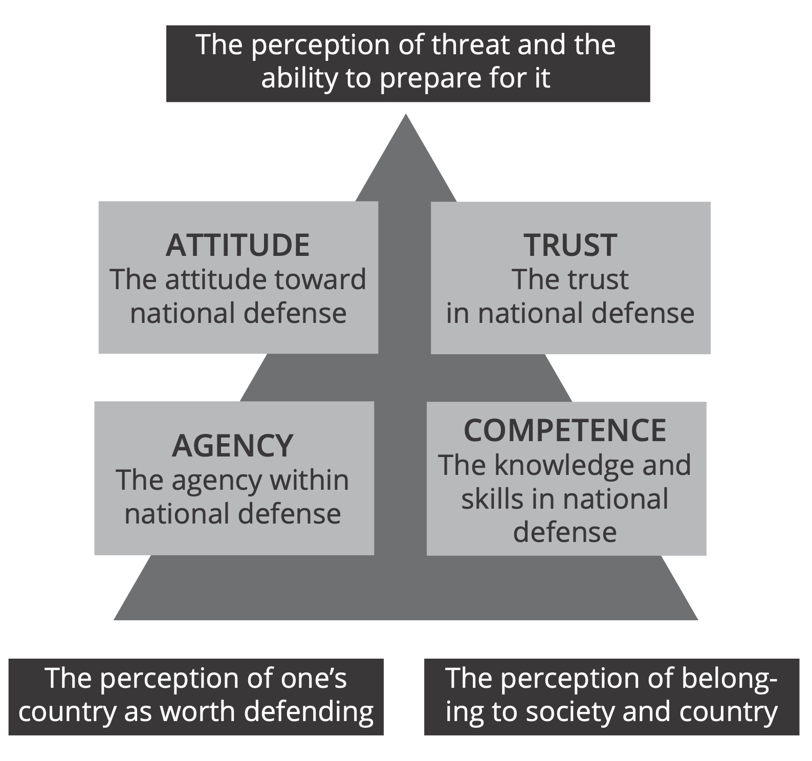 An individual’s defense relationship is built on a set of framing factors, including perception of belonging to society and the country (belonging), perception of one’s country as worth defending (worth), and perception of threats to society and the ability to respond to them (threats).[21] The individual is positioned within national defense through positioning factors such as attitudes, trust, competence, and agency.[22] This framework broadens the understanding of how citizens locate themselves within the field of national defense, for example, on the basis of their knowledge, skills, or perceived self-efficacy.