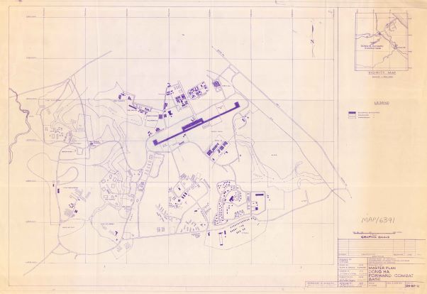 | NY-MAP/6391 Master Plan: Dong Ha Forward Combat Base [Vietnam] A blueprint copy of the Master Plan for the Dong Ha Forward Combat Base, dated 5 December 1967.  This large scale map features the base in its entirety, and includes a vicinity map indicating the airfields's location in Vietnam.  Features include Marine and US Army facilities. |