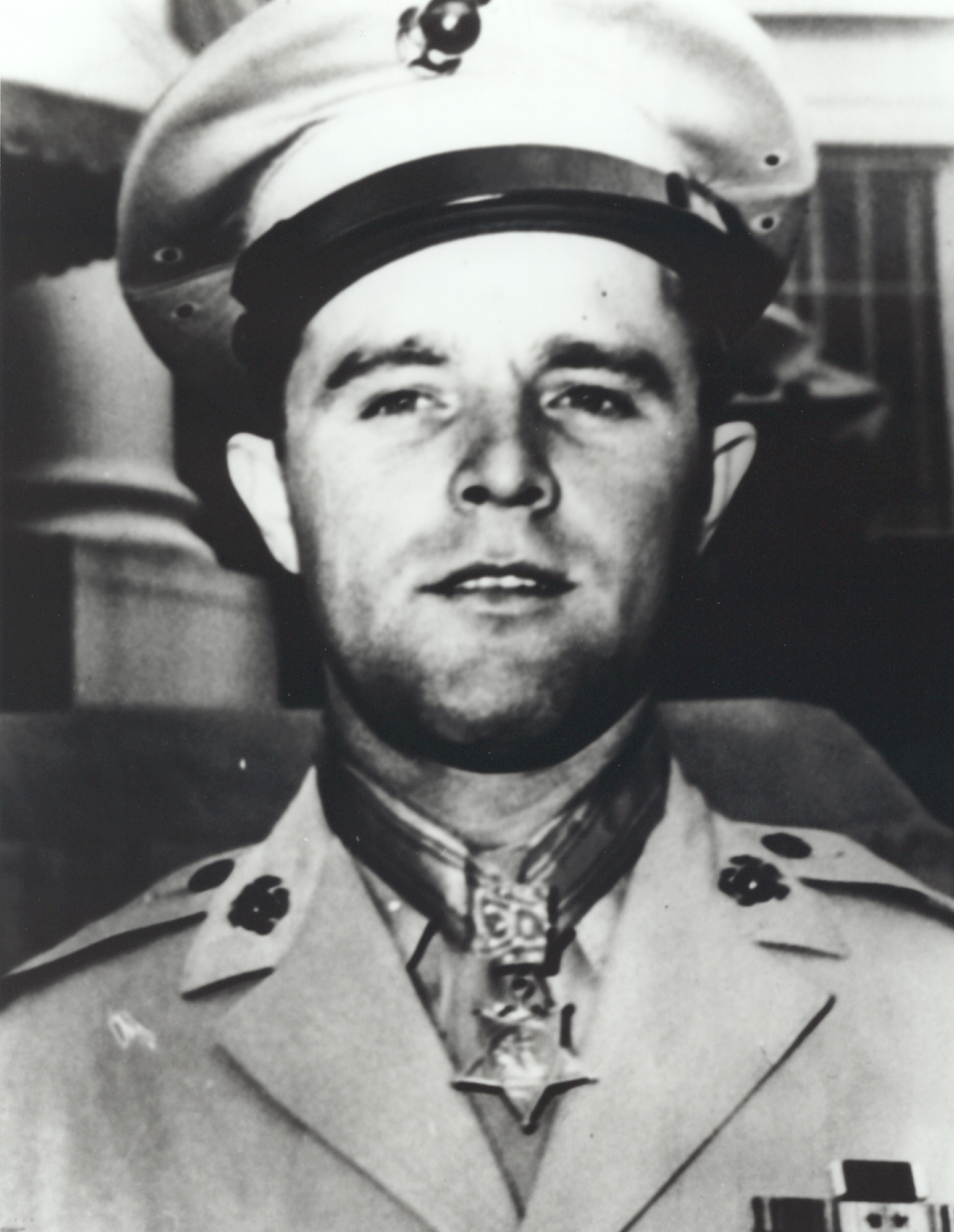Landing on Iwo Jima on 24 February 1945, he was slightly wounded by a shell fragment on 27 February but returned to duty on the same day. On 3 March due to heavy casualties, he became company commander, a position usually filled by a captain. On 7 March he led his company in a surprise attack against a strongly fortified enemy hill position, succeeded in capturing the objective, and in spite of withering fire returned forward to rescue two of his wounded men.
