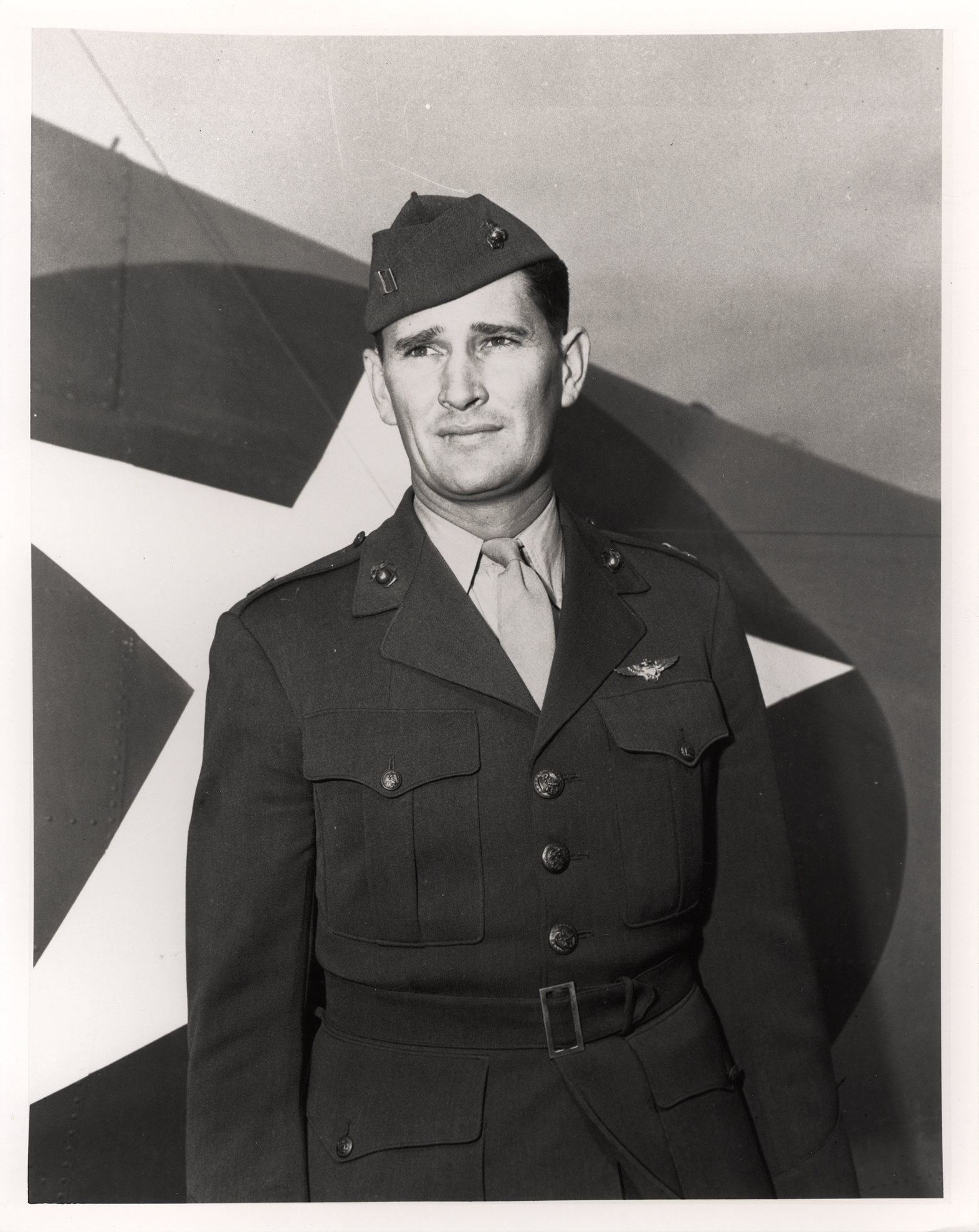 Honorably discharged from the Reserve on 8 August 1940, he accepted an appointment as an aviation cadet in the Marine Corps Reserve the following day. He was called to active duty 23 August and sent to Pensacola, Florida, for training. He completed further training at Miami, received his Marine wings and was commissioned a second lieutenant in the Marine Corps Reserve on 31 March 1941. He was advanced to first lieutenant 10 April 1942 while serving as an instructor at Pensacola and was promoted to captain 11 August 1942 at Camp Kearney, California.
