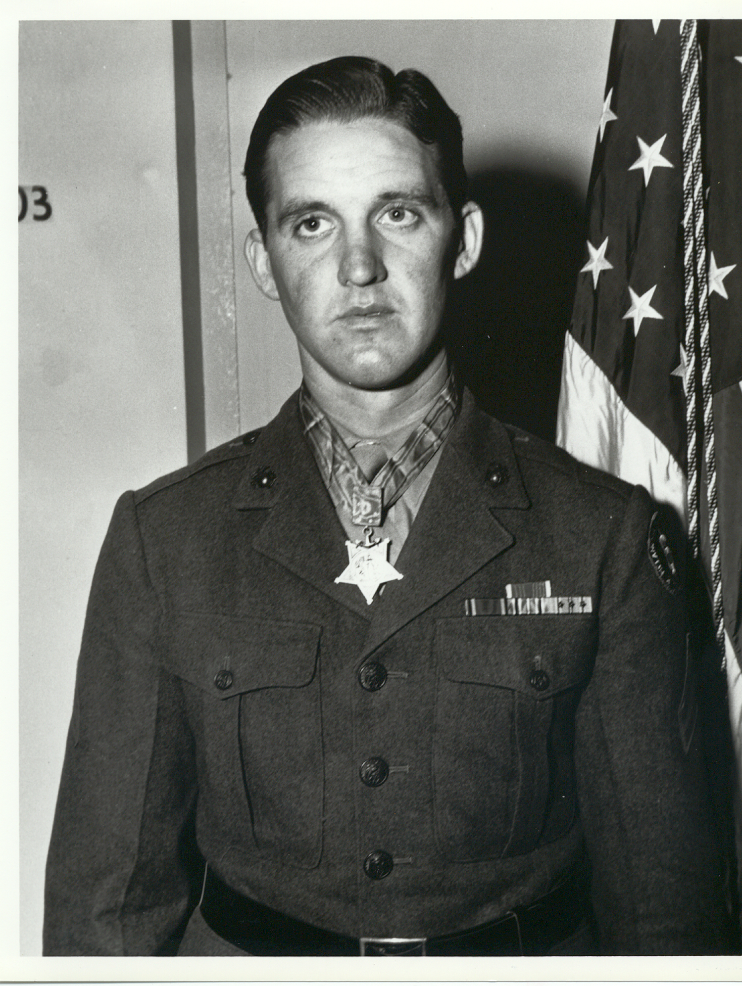 On 16 April 1945, Cpl Bush, as squad leader for 1st Battalion, 4th Marines, 6th Marine Division, led his men in a charge against an enemy stronghold during the final assault against Mount Yaetake in northern Okinawa. During that action, he ignored his own wounds until ordered to seek treatment. While in the makeshift medical camp, Cpl Bush threw himself upon an enemy grenade that had been hurled among the medical staff and other wounded Marines. On 4 October 1945, President Harry S. Truman, in a White House ceremony, presented Cpl Bush with the Medal of Honor for “conspicuous gallantry and intrepidity at the risk of his life above and beyond the call of duty.” He also was awarded the Purple Heart for wounds received on Okinawa.