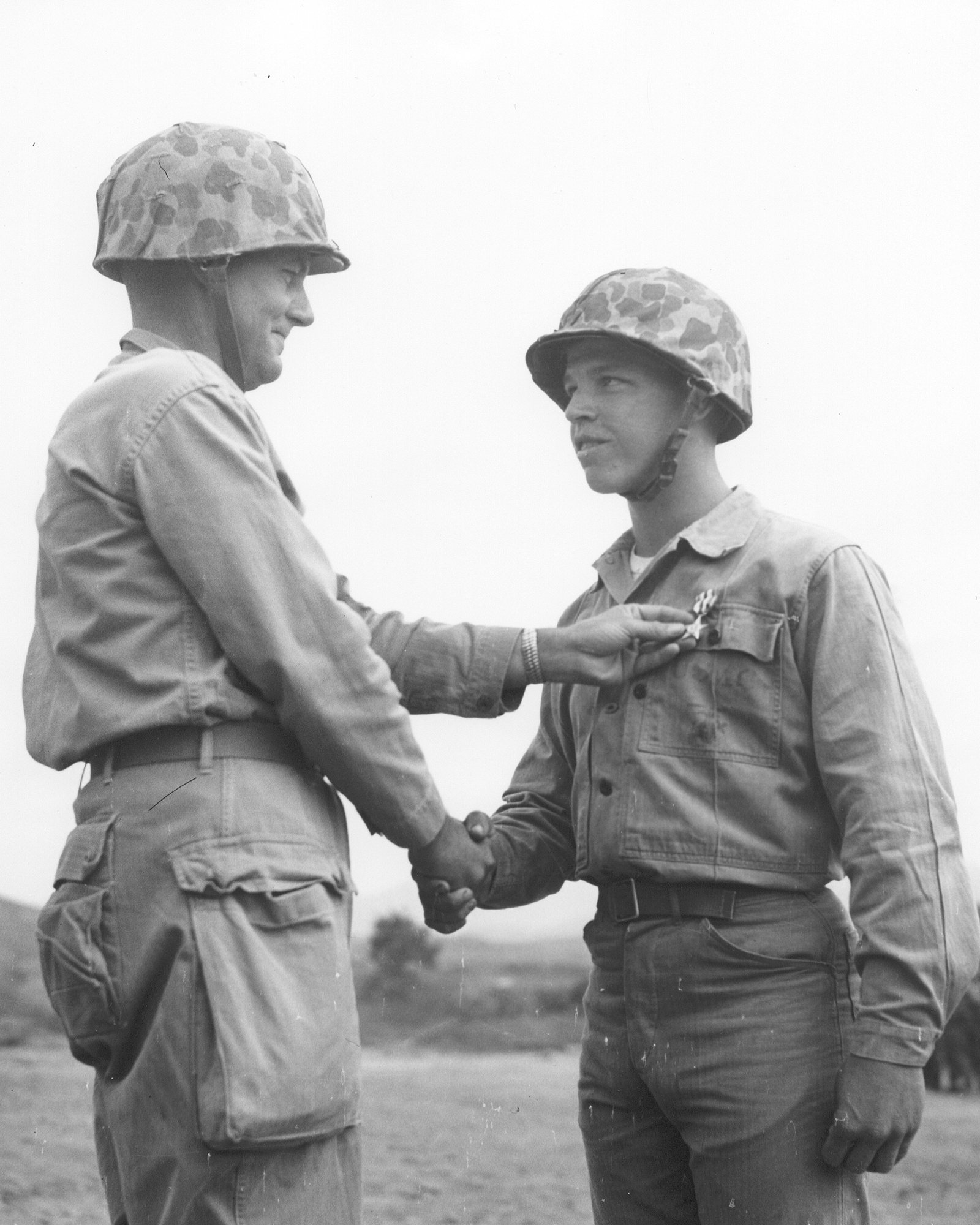He was again forced into the shelter by even more intense enemy fire, but refused to remain there. Moving out into the fire-swept area, he fired away at the enemy until he was mortally wounded, thereby covering the escape of the other Marines from the bunker.