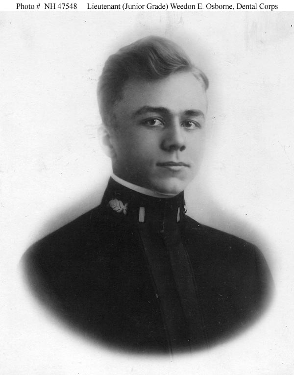 Weeden Edward Osborne was born in Chicago, Illinois, on 13 November 1893. He grew up on a combined working farm, school, and orphanage for boys, Allendale Farm, Lake Villa, Illinois, after losing both of his parents as a child. He graduated from Northwestern University Dental School in 1915 and was appointed Dental Surgeon in the U.S. Naval Coast Defense Reserve with the rank lieutenant (junior grade) on 8 May 1917. LTJG Osborne served at the Boston Navy Yard and on board the USS Alabama before he transferred to the 6th Regiment of Marines, American Expeditionary Force, France, on 26 March 1918 for service during World War I.