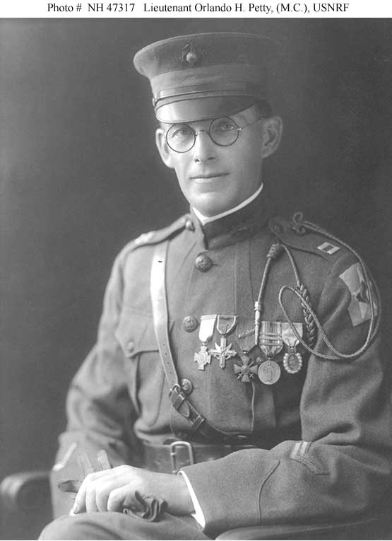 Orlando Henderson Petty was born 20 February 1874 in Harrison, Ohio, and graduated from Jefferson Medical College in Philadelphia, Pennsylvania, in 1904. He joined the teaching staff of the college in 1906. On 6 December 1916, he was appointed Assistant Surgeon, Medical Corps, U. S. Naval Reserve. He served with 5th Regiment of Marines, American Expeditionary Force in France during World War I.